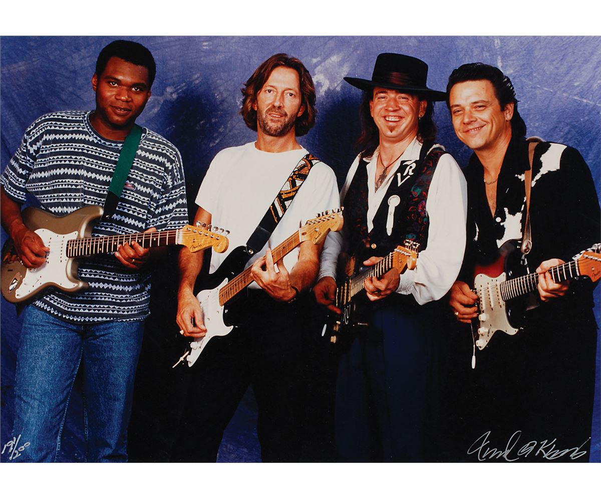 Limited edition color semi–glossy 13.75 x 9.75 photo of Robert Cray, Eric Clapton, Stevie Ray Vaughan, and Jimmie Vaughan, signed in silver ink by the photographer, “Robert M. Knight,” and numbered 191/200. Double-matted with a nameplate to an overall size of 20 x 16. In fine condition. Knight was at Alpine Valley taking promotional shots on behalf of Fender and this image was used in their Stratocaster advertisements.
