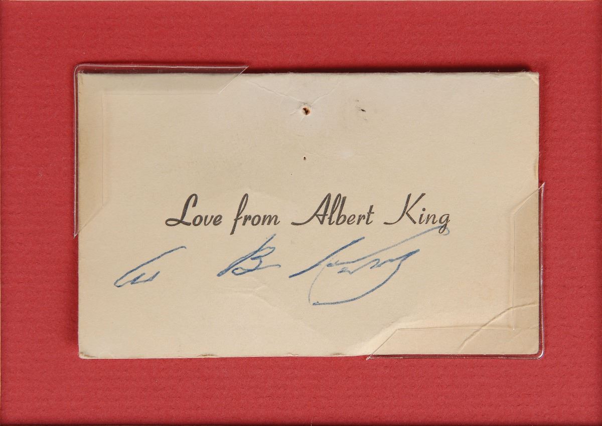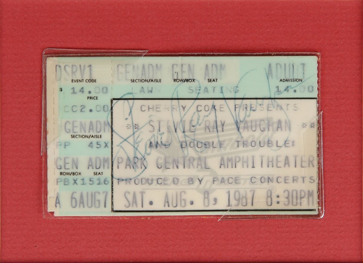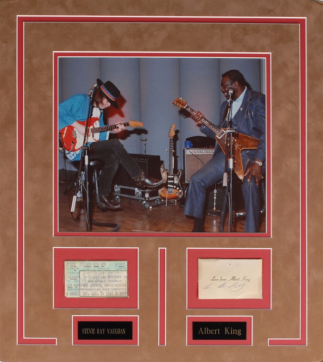 Ballpoint signature, “Stevie Ray Vaughan,” on a light green 3.5 x 2 concert ticket stub for an SRV and Double Trouble show at Dallas’ Park Central Amphitheater on August 8, 1987, and a ballpoint signature, “A B King,” on an off-white 3.5 x 2.25 sentiment card. Both are double-matted with two engraved nameplates and a large photo of the two blues legends to an overall size of 18 x 20. In overall fine condition, with light creasing to King’s card.