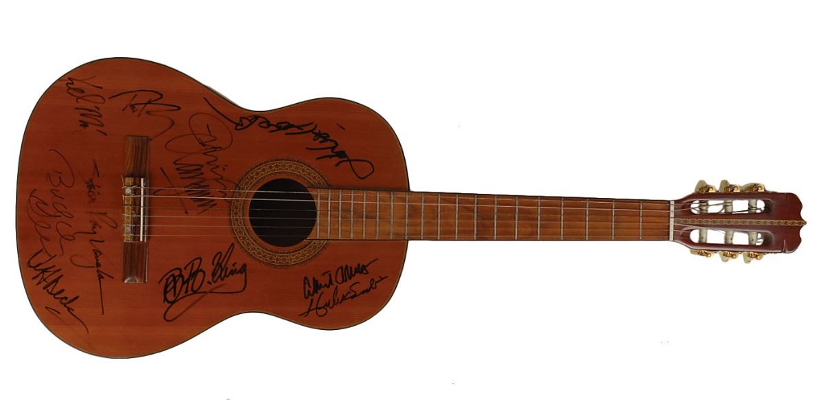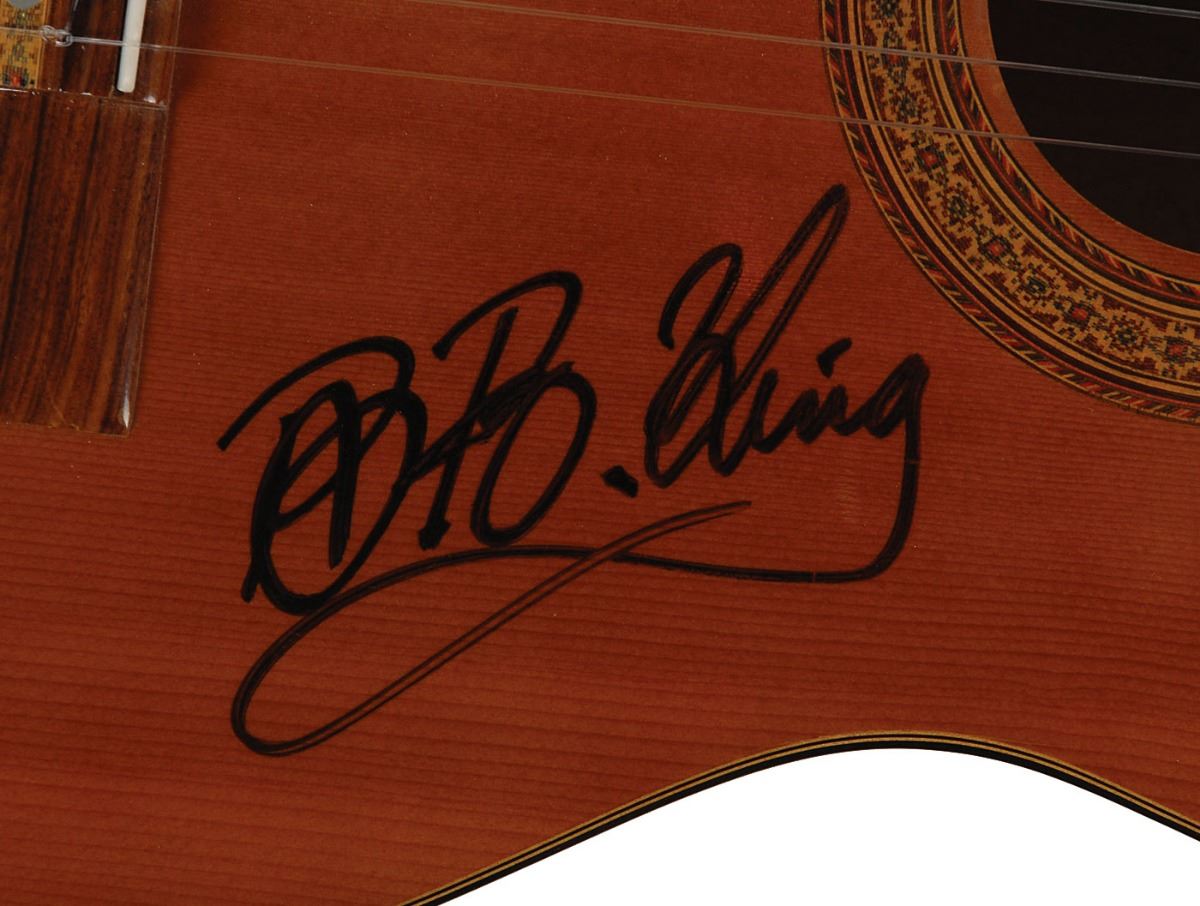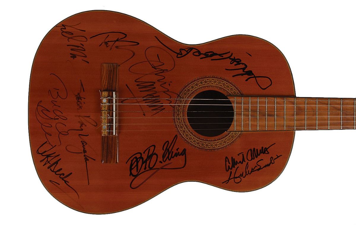 Highly desirable natural-finish right-handed acoustic guitar, signed on the body in black felt tip by ten blues legends, including: Stevie Ray Vaughan, Buddy Guy, B. B. King, John Lee Hooker, Jeff Beck, Keb Mo, Robert Cray, Jimmie Vaughan, Albert Collins, and Hubert Sumlin. In fine condition, with a nick to underside of neck. Consignor notes that the Guy, Mo, Cray, Sumlin, and Jimmie Vaughan signatures were obtained in person. Highlighted by SRV, King, Hooker, Collins, and Sumlin—all of whom are no longer living—this phenomenal guitar exists as a true musical keepsake, home to signatures of some of guitar’s most iconic and influential players.