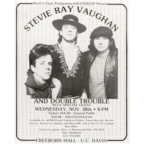 <B>Stevie Ray Vaughan and Double Trouble Freeborn Hall Concert Poster (1984).</B></I> Get ready for a cold shot of Double Trouble with this striking black and white poster, from Stevie and the band's gig at the University of California's Davis Freeborn Hall, back in the fall of 1984. The show was immortalized on the import CD, "Alone in the Ozone". The poster measures 15.25" x 19", and is in NM- condition. Hotshot guitar players will come and go, but there'll never be another Stevie Ray!<BR><BR><b>Shipping:</b> Flat Material, Large (<a target="_blank" href="http://www.heritageauctions.com/common/shipping.php">view shipping information</a>)