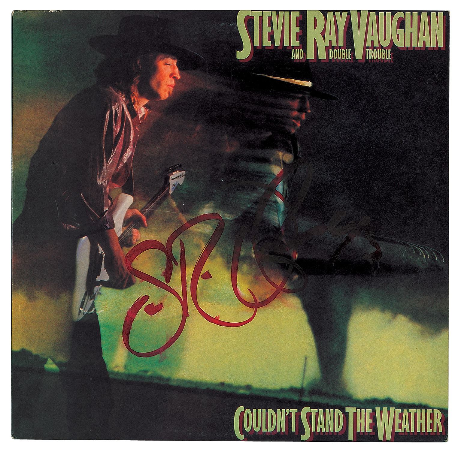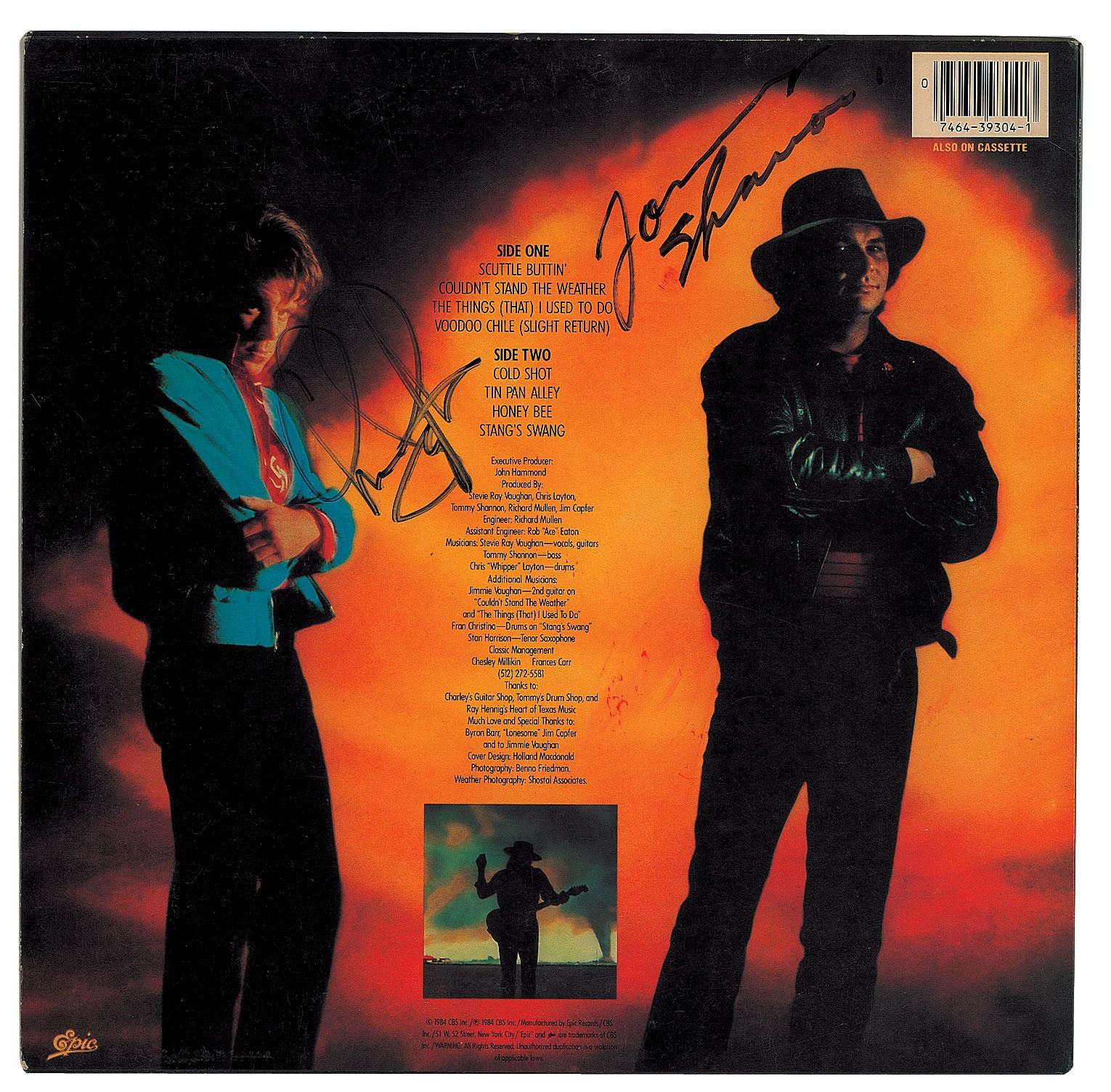 Couldn't Stand the Weather album signed on the front cover in red paint pen by Stevie Ray Vaughan, and on the back cover in black felt tip by Double Trouble band members Tommy Shannon and Chris Layton. In fine condition. The record is included.