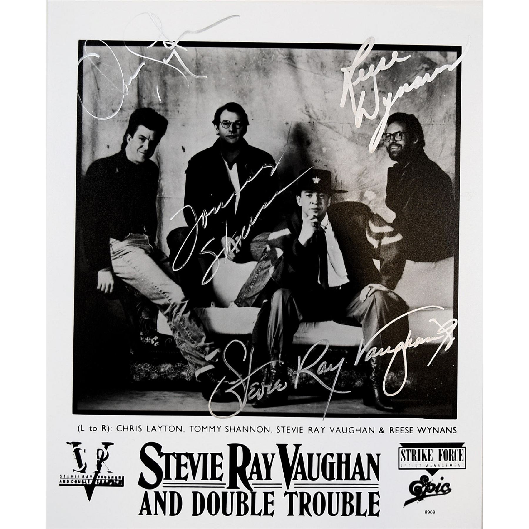8 in. by 10 in. Stevie Ray Vaughan and Double Trouble black and white Epic promotional photo. Signed by Stevie Ray Vaughan 90, Tommy Shannon, Chris Layton, and Reese Wynans.