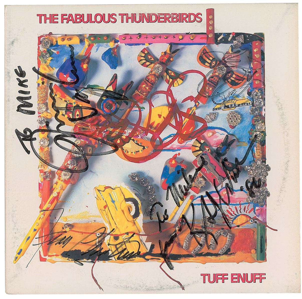 Tuff Enuff album signed upside down on the front cover in red paint pen by Stevie Ray Vaughan, and signed and inscribed in black felt tip by The Fabulous Thunderbirds, "To Mike, Jimmie Vaughan," "To Mike, from Kim Wilson, '86," "Fran Christina," and "Preston Hubbard." In fine condition, with light scuffing. The record is included. A desirable rarity with both Vaughan brothers on a single item.