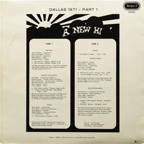 <B>Stevie Ray Vaughan (in Cast of Thousands) "A New Hi Dallas 1971 -- Part 1" Stereo LP and Poster Tempo 2 T-1(1971)</B></I> While all you Stevie Ray Vaughn fans are going to go crazy over the inclusion of his earliest recorded material (with the band known as Cast of Thousands), this compilation of Dallas, Texas bands from the late 1960s-early 1970s era stands up pretty well on its own right. The bonus poster included with the album is complete with a photo or our teen-aged Stevie. Also included are tracks by the Mint, featuring Jimmy Wallace, a hugely popular local band in their time. In fact, Jimmy (who these days can be found producing the annual Dallas Guitar Show) and Stevie Ray were friends and neighbors, and their respective bands rehearsed across the street from one another! The cover, record and poster all grade EX-7.