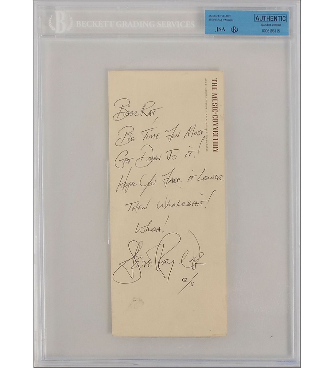ANS, written vertically on a 4 x 9.5 Music Connection business envelope, no date. Brief note to “Bigge Rat.” In full: “Big time fun must get down to it! Hope you can fade it lower than whaleshit! Whoa!” Envelope is encapsulated in a plastic Beckett/Spence authentication holder. In fine condition, with some light horizontal creases and several fingerprints to back of envelope.