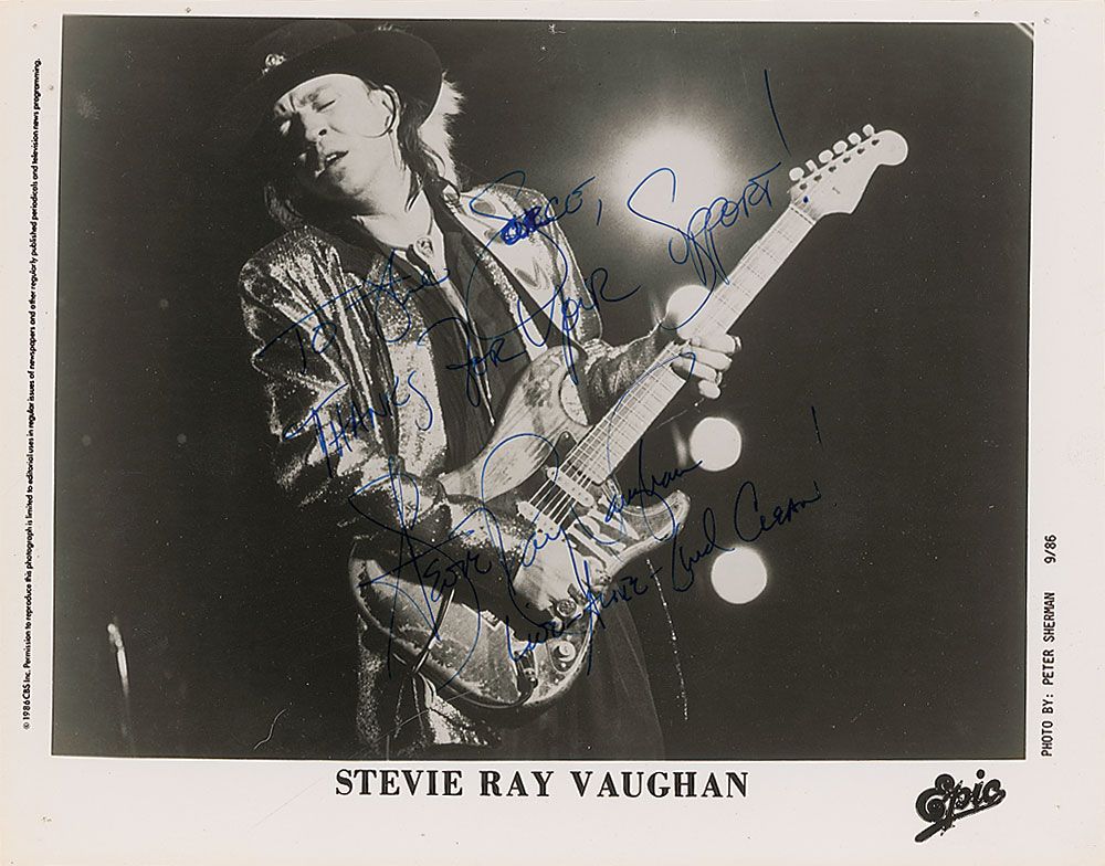 Glossy 10 x 8 Epic Records publicity photo of Vaughan on stage, signed and inscribed in blue ink “To the Source, Thanks for your support! Stevie Ray Vaughan, Live–Alive– and Clean!.” In fine condition, with a couple staple and tack holes to corners and borders. “The Source" was the rehab center that Vaughan stayed at after a long battle with alcohol in the late 1980s.