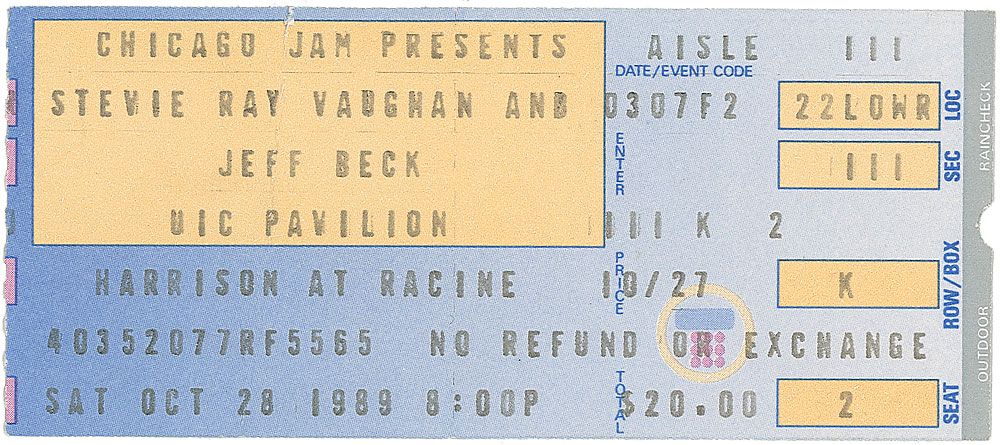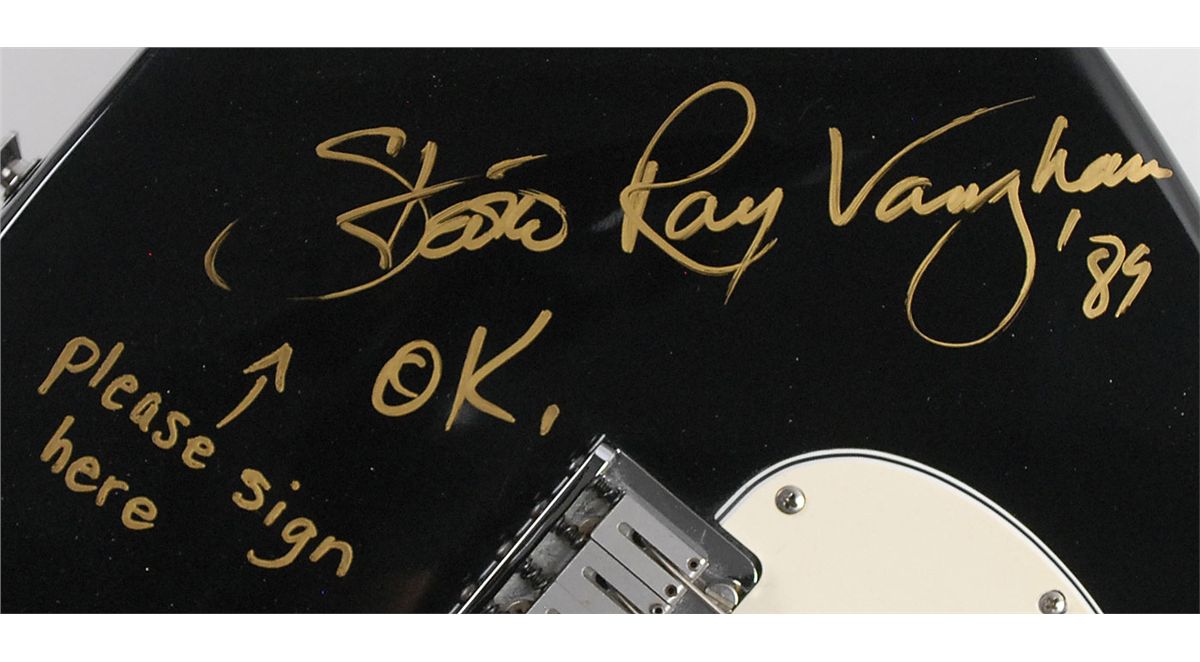 Black-bodied Fender Stratocaster electric guitar, signed on the body in gold ink, “Stevie Ray Vaughan ‘89, O.K.,” with a collector’s notation under the signature asking, “Please sign here,” with an arrow pointing to the upper portion of the body. In fine condition. Consignor notes signature was obtained on October 28, 1989, at the UIC Pavillion in Chicago, and is accompanied by a ticket stub from the performance as well as an unissued backstage pass. Vaughan signed guitars are quite rare, with this being just one of a scant handful we have ever offered.