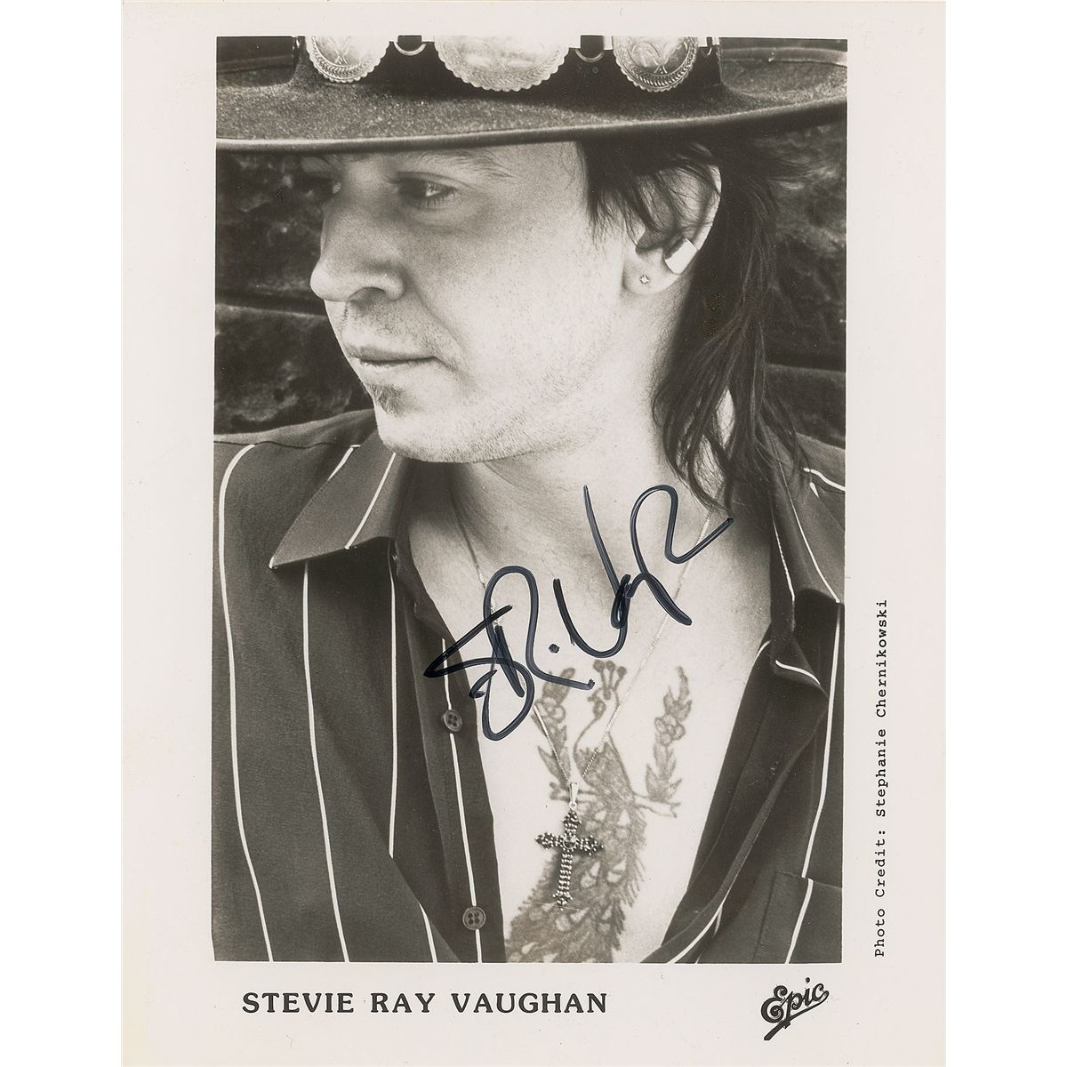 Glossy 8 x 10 Epic Records publicity photo, quickly signed in black felt tip by Vaughan. In fine condition, with a few scattered trivial surface dings.
