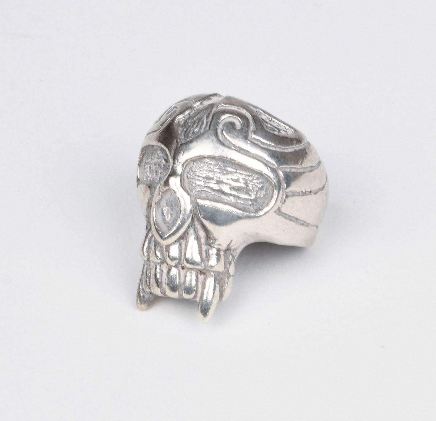 Stevie Ray Vaughan's personally-owned and -worn sterling silver skull ring, weighing 19 gm, worn on stage by the legendary guitarist in the late 1980s. In fine condition, with a slightly indented band. Accompanied by a letter of provenance from Broken Homes frontman Michael Doman, in part: "I am a professional musician whose early career crossed paths with SRV during the years 1987-1991. I played dozens of shows with SRV and Double Trouble as an opening act while a member of the MCA recording act Broken Homes. I came into ownership of this piece of jewelry by accident. We opened the east coast leg of a Double Trouble tour in the late 1980s. One memorable date was staged at the Capital Theater in northern New Jersey, near my parents' home in Philadelphia. My group was a critical favorite and scheduled to be photographed for a future issue of Rolling Stone magazine following Stevie's performance. While visiting my parents while on a break, I left behind a suitcase with my jewelry and stage clothes. It was too late to retrieve it for the show or the photo shoot. Stevie had come off stage and noticed I was upset. He solved my problem by removing his scarves and jewelry and giving them to me for the photo session. It has been a long time but I remember the scarves were wet and there was probably enough DNA to clone a new SRV. I introduced him to my parents and awe-struck friends as he left the building. At the end of the shoot I put Stevie’s stuff into two large Tupperware containers with the intention of returning them to him as soon as possible. The return never happened. When I rang him at the hotel he said to bring the items to the next show, but we weren't scheduled to play together for a few nights and the items ended up sitting forgotten in a road case…until I discovered them 10 years later, still in my Mothers' Tupperware. The ring was owned and worn by the late, great Stevie Ray Vaughan."