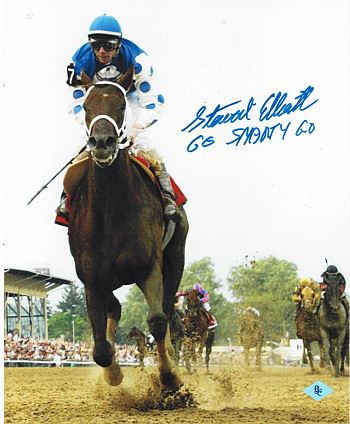 Smarty Jones was the winner of the 2004 Kentucky Derby and Preakness Stakes. He was a third-generation descendant of Mr. Prospector, and as such Smarty Jones is related to many recent Triple Crown hopefuls including Funny Cide, Afleet Alex and Fusaichi Pegasus. Also included in Smarty Jones' pedigree are Triple Crown winners Secretariat and Count Fleet, and such other Triple Crown race winners as Northern Dancer, Foolish Pleasure and the mighty Man o' War, who is considered #1 on the list of Blood-Horse magazine List of the Top 100 U.S. Racehorses of the 20th Century. Jockey Stewart Elliott has hand signed this Smarty Jones 2004 Preakness 8x10 Photo with Go Smarty Go inscription. Certificate of Authenticity from Athlon Sports Collectibles.