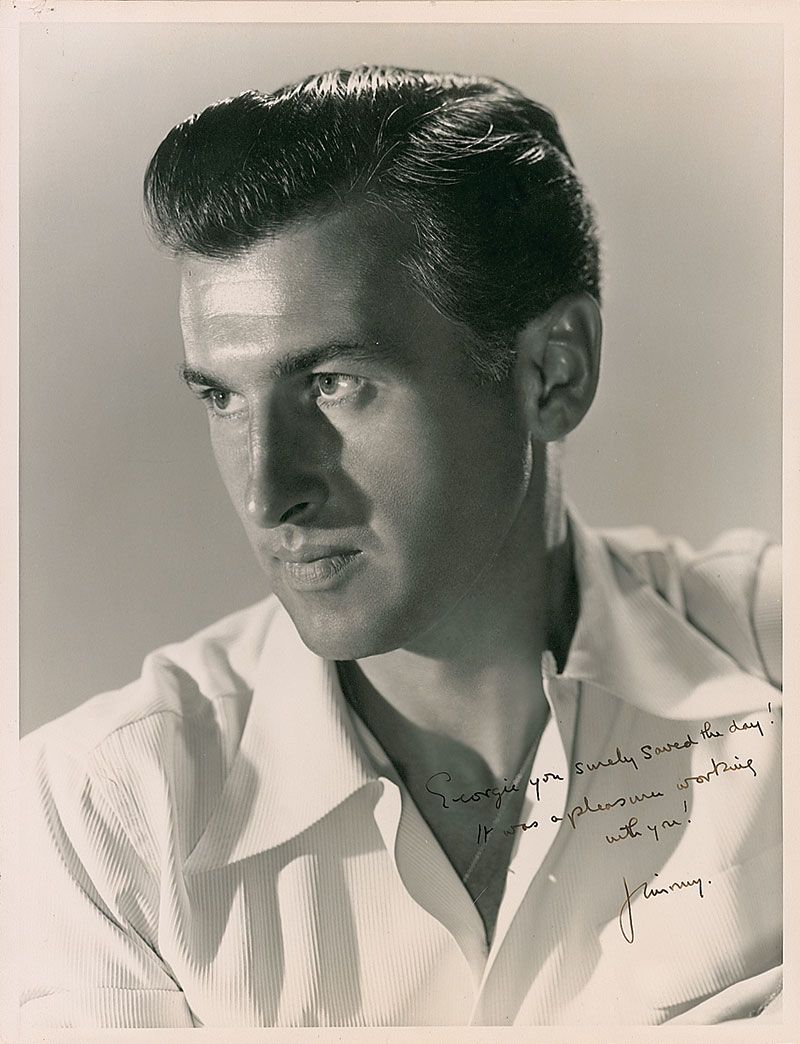 Handsome vintage matte-finish 10 x 13 photo, signed and inscribed in fountain pen to assistant director George Rhein, with his uncommon real first name, “Georgie you surely saved the day! It was a pleasure working with you! Jimmy.” In fine condition, with some light corner creases, a few edge dings, and staple hole to top left edge.