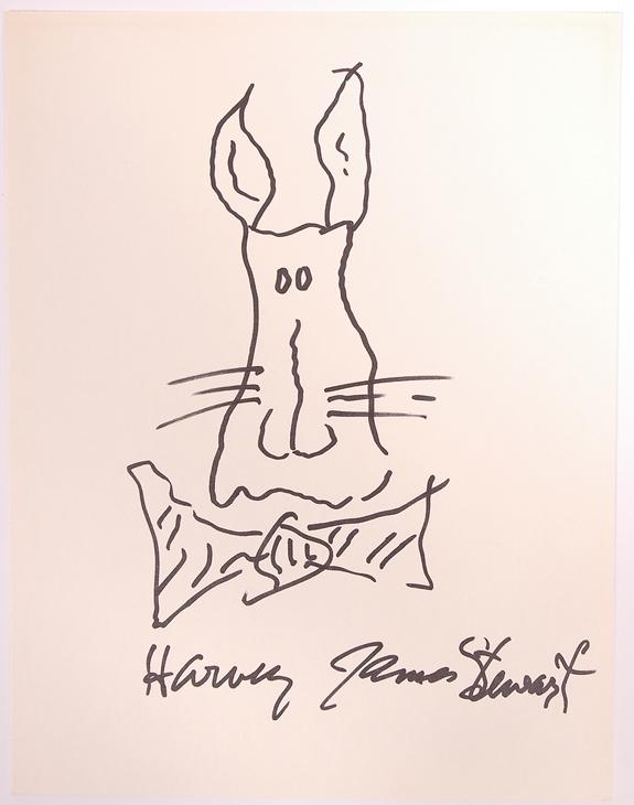 Stewart, James - Hand-drawn and signed sketch of Harvey. Autograph sketch signed "Harvey / James Stewart" with a black Sharpie on 11x8½" heavy white card stock. Harvey  was a 1050 film in which Stewart played a middle-aged man whose best friend was a 6 ft. 3½" rabbit named Harvey. Very fine.