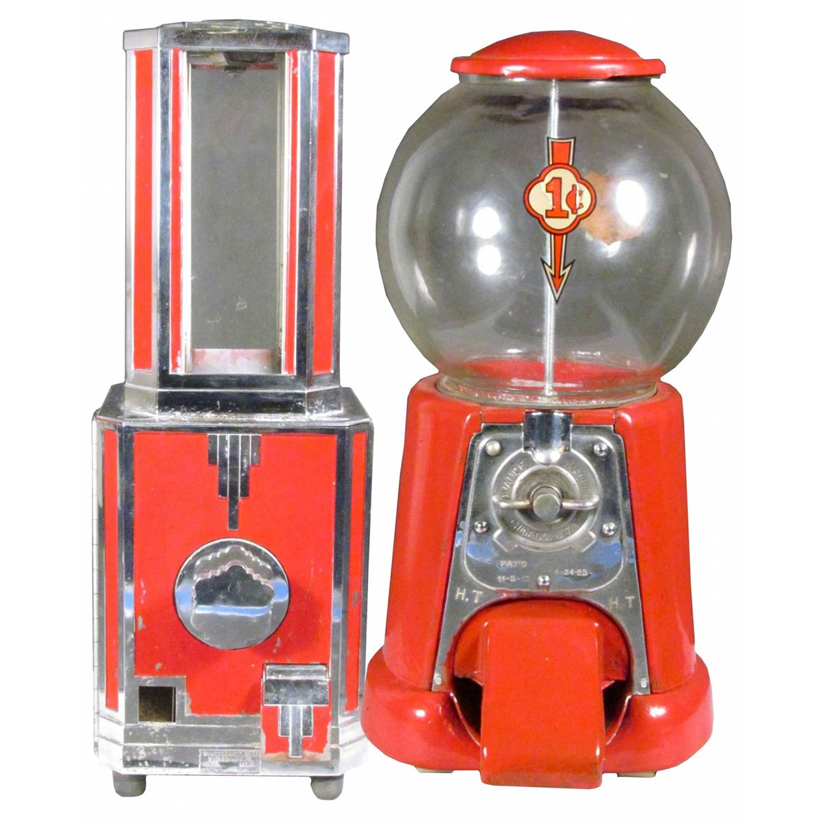Stewart & McGuire Art Deco Vendor. 1935, Inspired by the Empire State Bldg. Very good all original working condition. 18 inches tall. And a Advance Machine Company Big Mouth One Cent Vendor. 1912, Aluminum machine. Very good repainted condition, comes with keys. 14 inches tall.