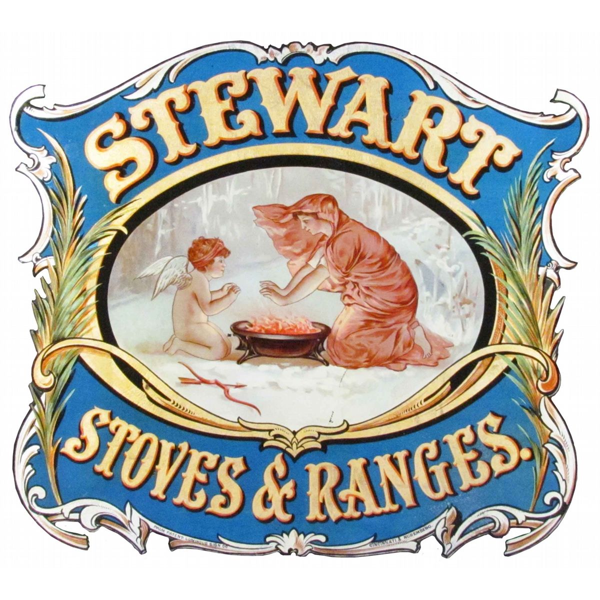 Stewart Stoves & Ranges Reverse Glass Sign. Applied transfer. Palm Patent Luminous Sign Co. Cincinnati & Neremberg. Some normal crazing otherwise excellent condition. 16 1/4 X 15 1/2 inches. Start Price $200