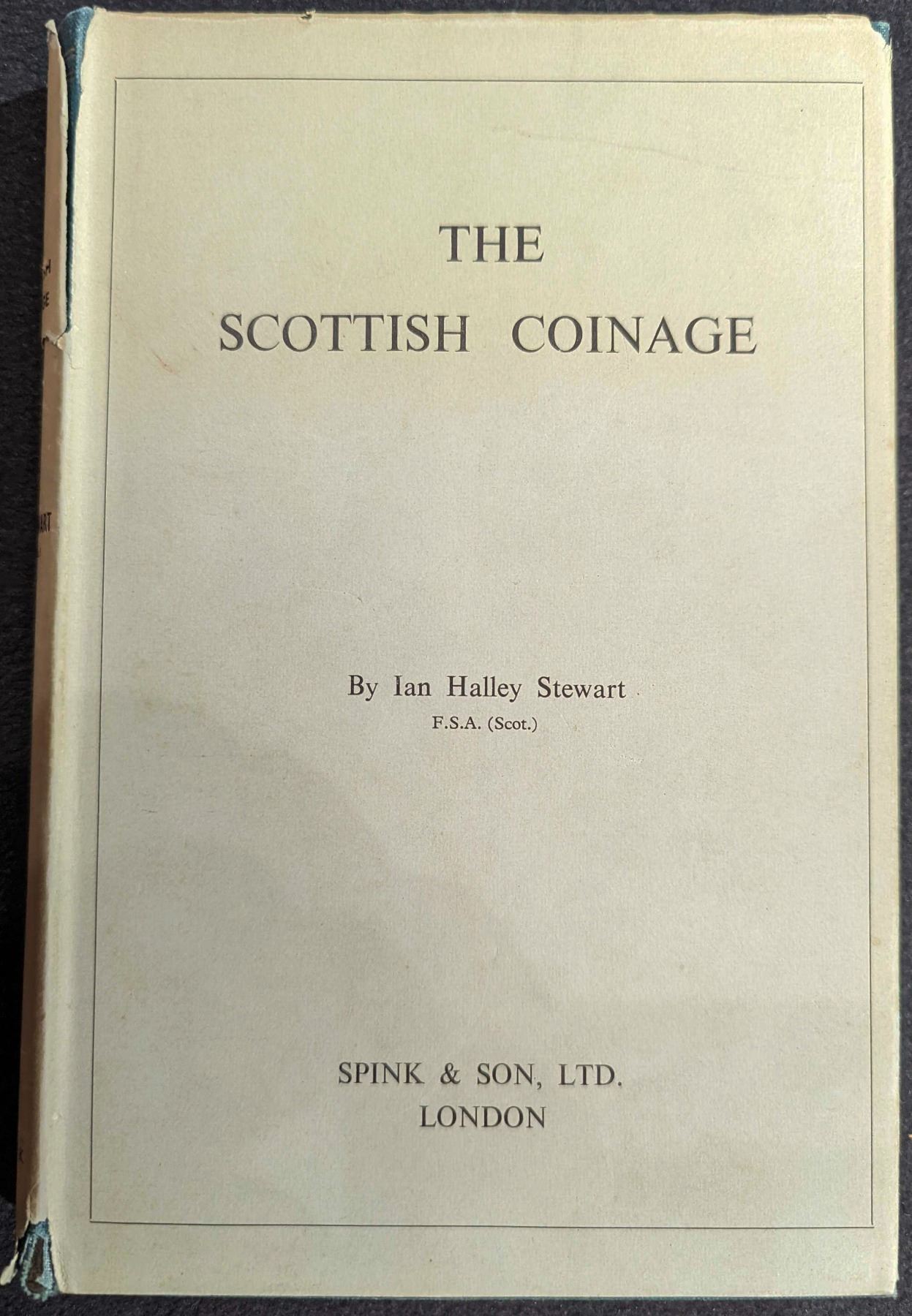 Stewart, Ian Halley FSA. THE SCOTTISH COINAGE. Spink & Son Ltd., London. 1955. 12mo. xi, (1), 181, (1) pages. Original green cloth, gilt, jacket. Endsheet map and genealogical table. Text figures. 21 fine coin plates. Very Good. The first edition of this primary work on the subject, covering the 12th to the early 18th centuries. There has been no complete book written on Scottish coins for sixty-five years. In the last few years with the greatly increased interest in numismatics, the need has grown for a book on Scottish coinage which presents in a straightforward way an historical and critical account of the different types and issues, combined with a list of known coins. In this work there is quite a large amount of new material on the Scottish series of coins and several cases of rearrangement. Lot weight: 1 lbs 0oz. Subject(s): Scottish Coinage.