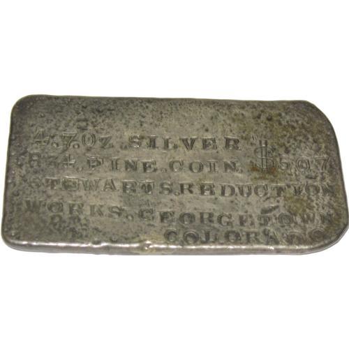 <B>Stewart's Reduction Works, Georgetown.</B></I> A uniface ingot that reads: 4.7. OZ. SILVER / 834. FINE. COIN. $5.07 / STEWARTS. REDUCTION / WORKS. GEORGETOWN / COLORADO. An exhibition ingot for a mill product from the Stewart Mill near Georgetown. The Stewart Mill was built in the mid 1870s, and was located in the lower part of town. It had 20 stamps, a stirred vat leach plant, furnaces, and could treat 24 tons per day, according to Corbett in the <I>Colorado Directory of Mines,</B></I> 1879. Within a year, it was relatively inactive, according to Frank Fossett. No mention was made of the mill in later <I>Reports of the State's Resources.</B></I> The mill may have processed some of the rich silver Pelican mine ores from nearby Silver Plume. This is an unusual flat ingot, made in a simple manner to show off the product (silver), without the need for a traditional thick silver ingot. The crude, hand-punched style of this ingot renders it easy to read, correlative with some other exhibition ingots, though this same crudeness is also present in some questionable ingots. The individual letter punched design is somewhat problematic, though would have been necessary if it was uniquely made as an exhibition ingot (example- Belcher, 1875).<BR><I>From The Kagin Reference Collection of Frontier Ingots.</B></I>
