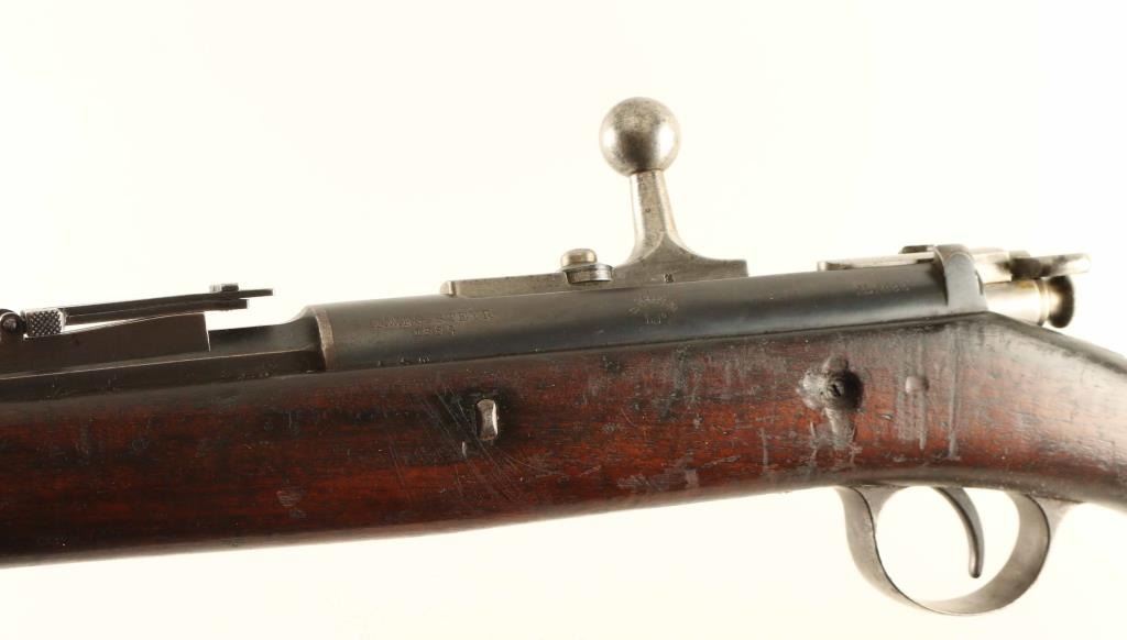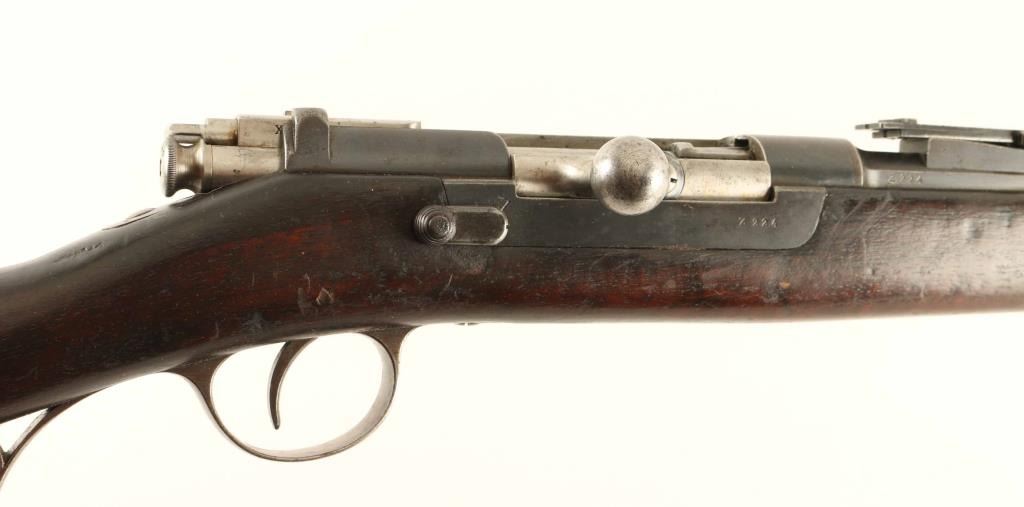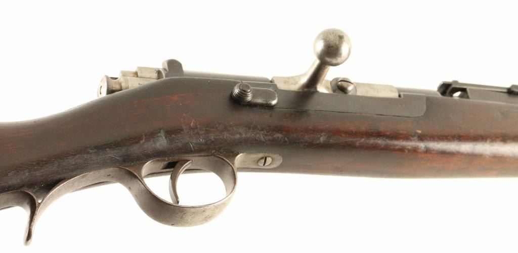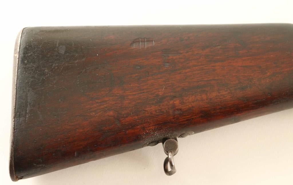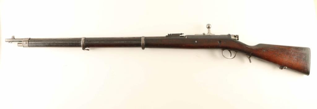 Austrian made bolt-action service rifle chambered in 8x60Rmm, built for Portugal circa 1886 and modeled after the Mauser 71-84. It features a blued finish, 32.25" barrel, dovetailed inverted 'v' front sight, flip-up ladder rear sight, full length tube magazine, bayonet lug, cleaning rod, polished bolt with straight handle, magazine cut off switch, manual safety, sling swivels and smooth full length wood stock with metal buttplate & two illegible circular cartouches on the buttstock. Serial numbers match on the receiver & barrel with different matching numbers on the bolt handle and safety. Rifle exhibits a molten brown patina on the barrel mixed with bare metal and retains approximately 90% of it's thinning blued finish on the receiver showing light edge wear. Action is smooth, bore is excellent and wood stocks are very good with numerous small blemishes. Condition is fine. ***Antique Firearm***