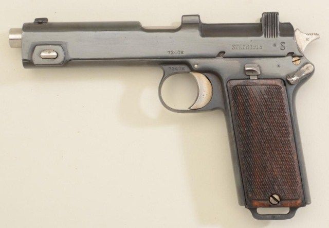 Steyr 1918 semi-auto pistol 9mm cal., #7240X, re-finished with Austrian markings on trigger guard, good action, interior and good overall. Est.: $200-$400.
