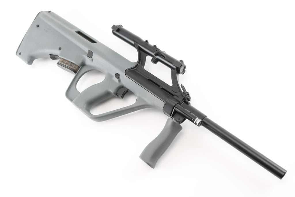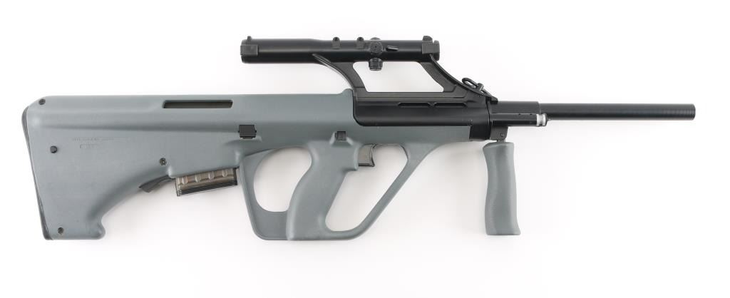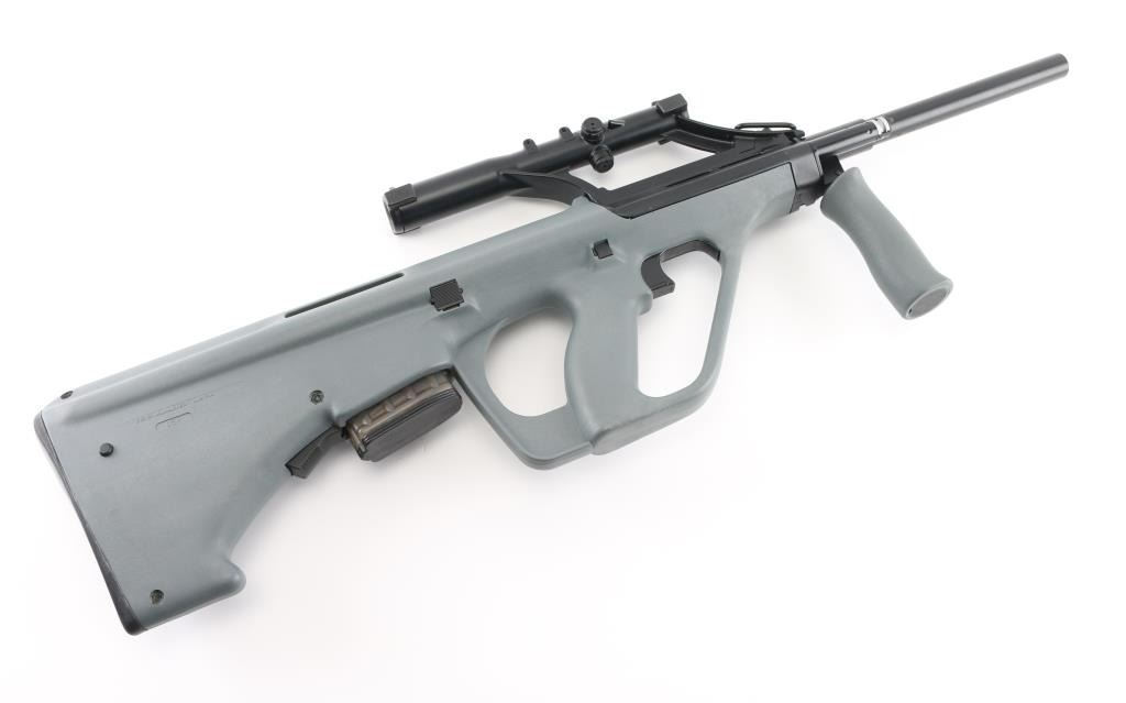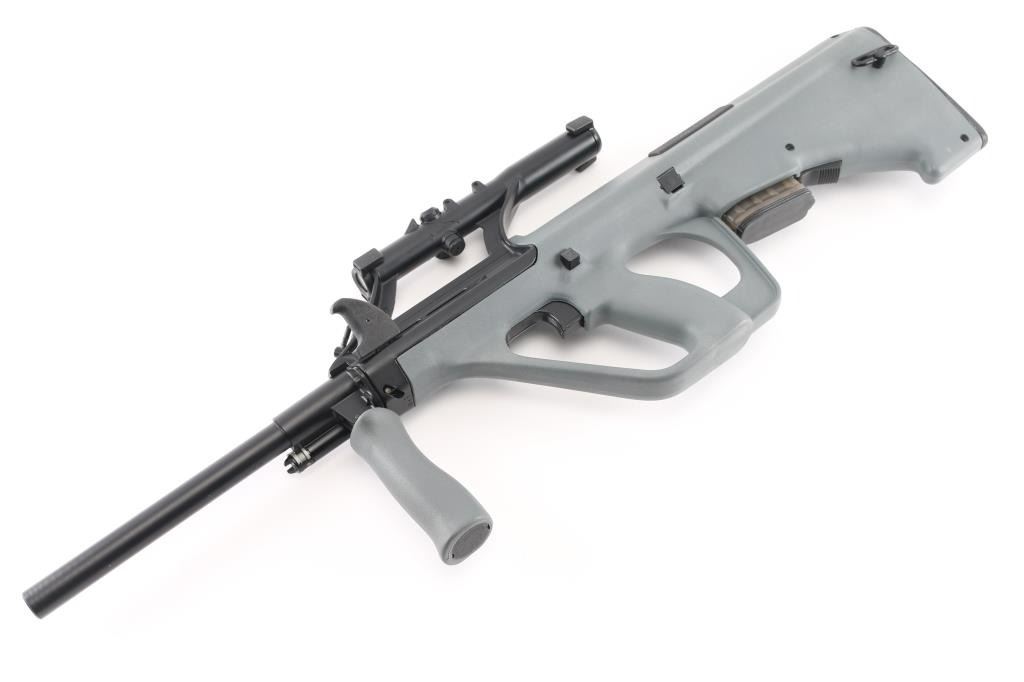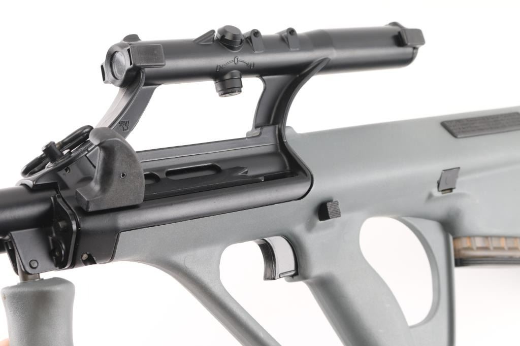 Austrian semiautomatic rifle imported by Gun South, Trussville AL. Barrel stamped 223. Features bullpup layout, gray polymer furniture, quick detachable 16" barrel with plain unthreaded muzzle, folding forward grip, integrated 1.5x optical sight with circle reticle and rudimentary back up iron sights molded into tube, manual safety, storage in butt, sling swivels. Bore is very good condition, appears hard chrome lined. Retains 95% finish on metal surfaces, with handling marks. Stock is very good condition. Includes (1) magazine (9 rd). Condition is NRA Excellent *** Modern Firearm ***