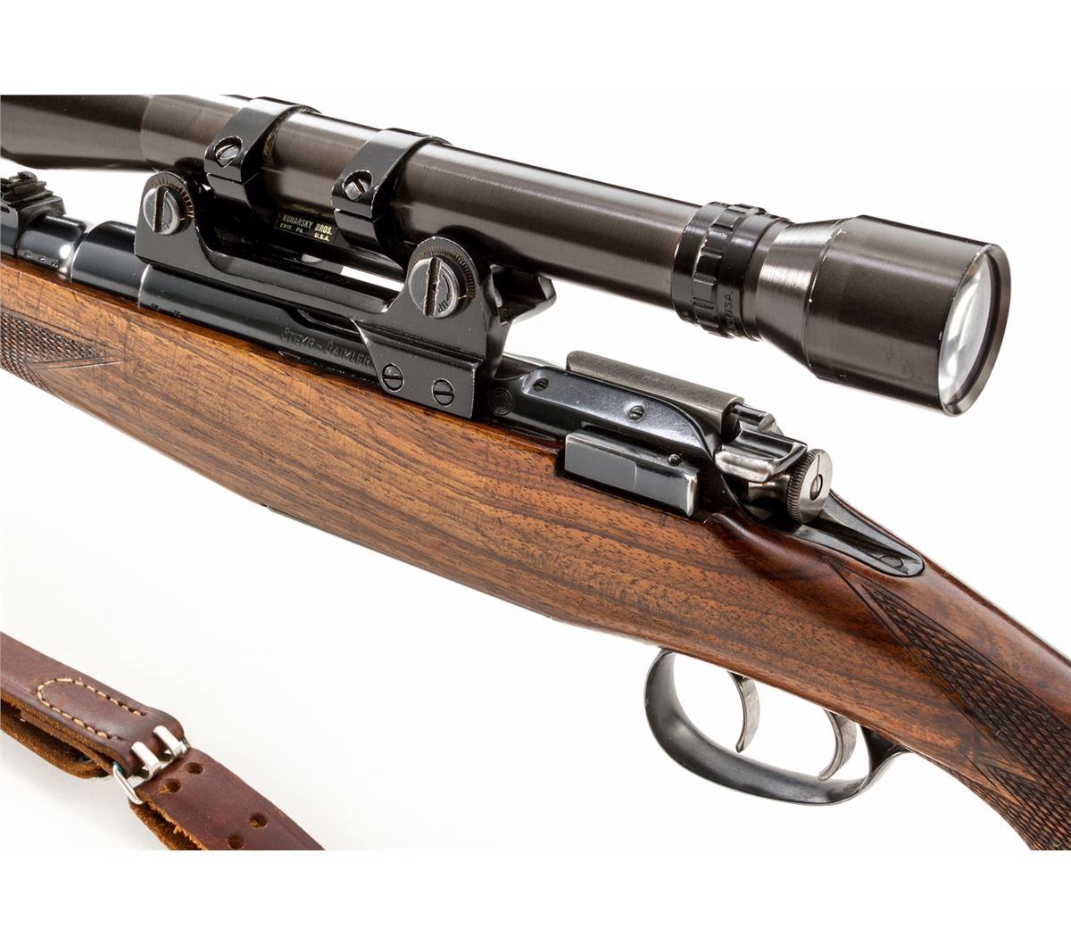 Steyr Mannlicher Bolt Action Rifle, #18112, .30-06 cal., 20'' barrel, blue finish, cheekpiece full-length walnut stock, brown Pachmayr butt pad, and commercial leather sling. Topped with a Balfor scope. Condition is fine retaining approx. 94% blue. Stock shows moderate field use with light scratches and scuffs, and one minor loss at cheekpiece. Silky smooth action, bright bore. Set triggers need adjustment. Est.: $600-$800. (C&R)