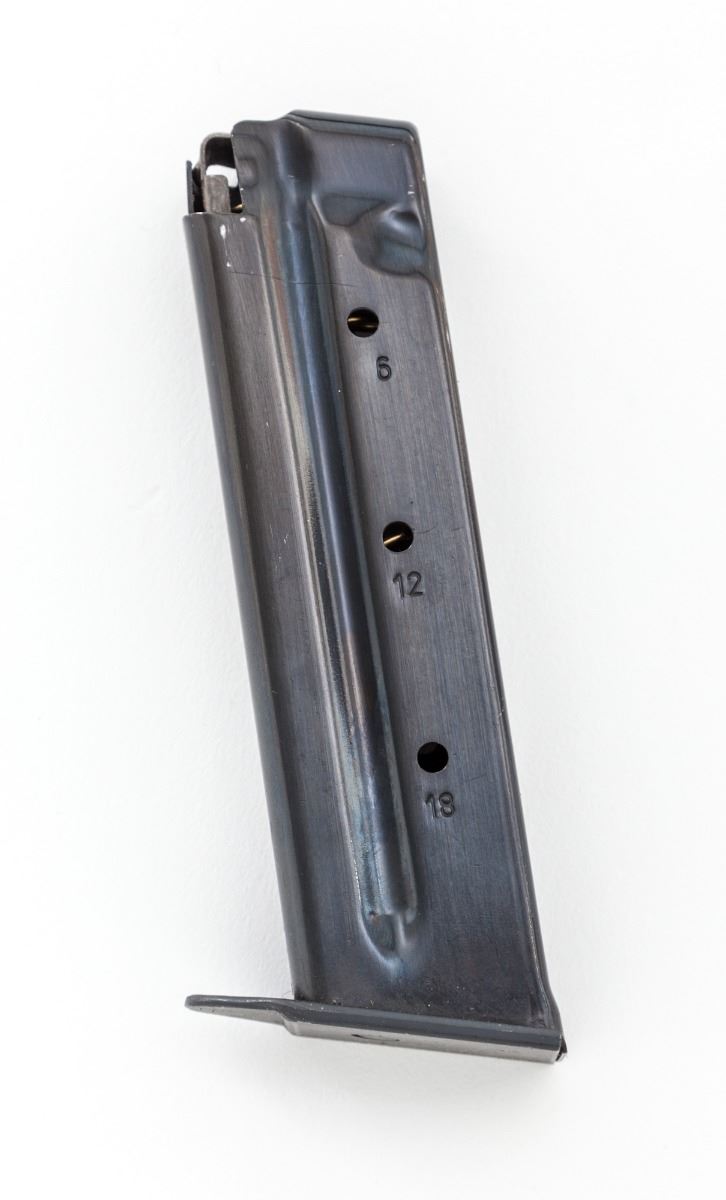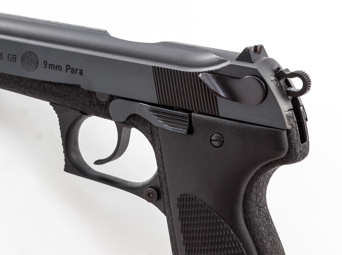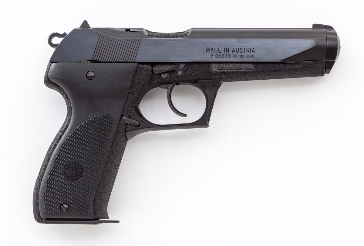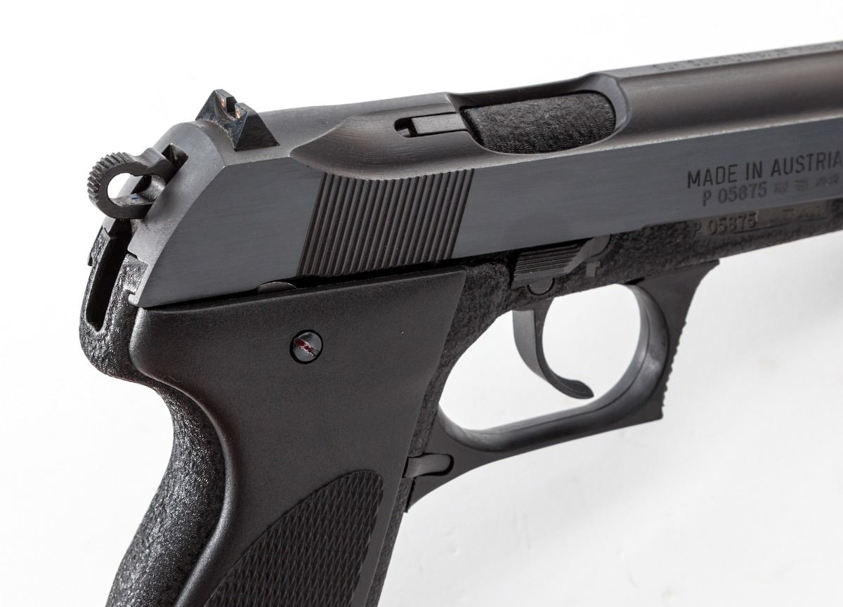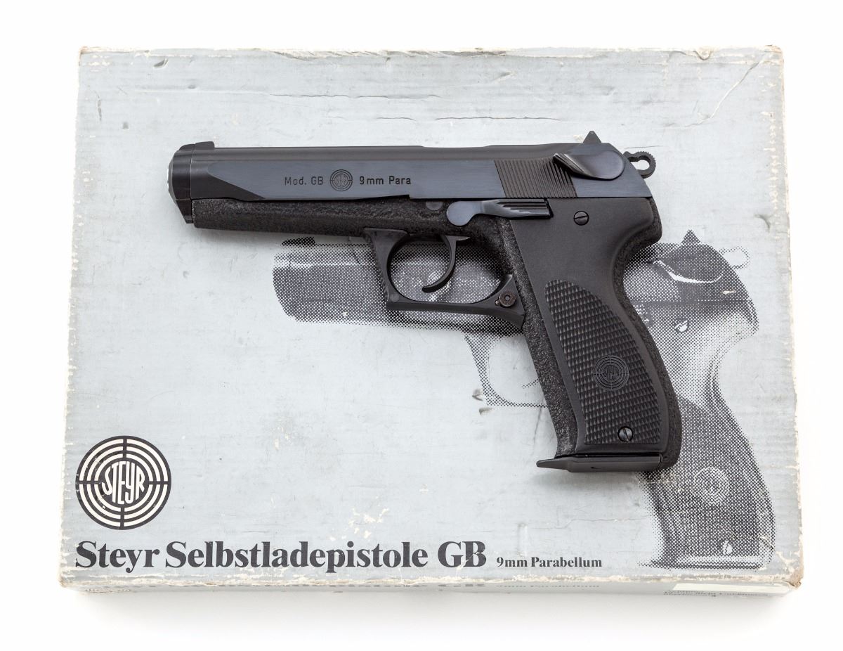 Steyr Mannlicher Model GB Semi-Automatic Pistol, #P05875, 9mm, 5-1/4'' barrel with Polygon rifling, blue slide with textured black frame, checkered black plastic grips, white three-dot sight system, with two (2) 18-round magazines, in original Steyr box with three of the original cleaning kit pieces.  Imported and marked on top of slide ''Gun South, Inc., B'ham, AL''.  Condition is excellent, appearing as new, showing signs of very little, if any, use.  Est.:  $800-$1,200.  (Modern) (Not available to Calif. residents.)