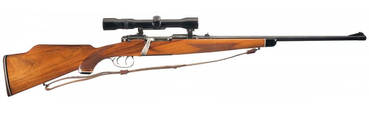 Manufactured in Austria between 1956-1960 with standard markings. Features a ramp front and two leaf folding rear sights with a Kahles Wien Helia 2.3-7x 2 S2 scope. Bright bolt, follower and double-set triggers with a checkered forend and pistol grip stock, raised shadowline cheekpiece, hard rubber grip cap, Pachmayr rubber recoil pad and leather sling.