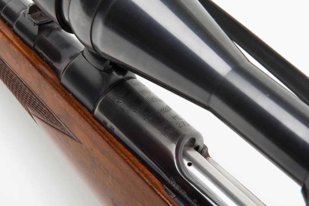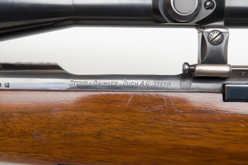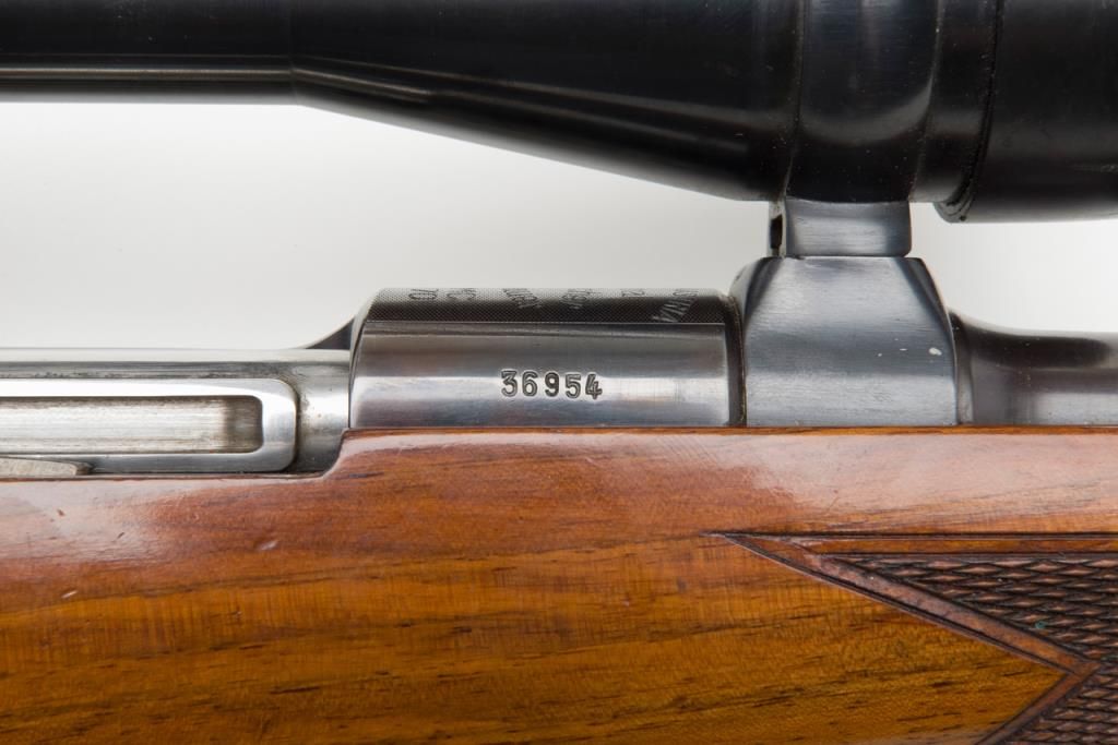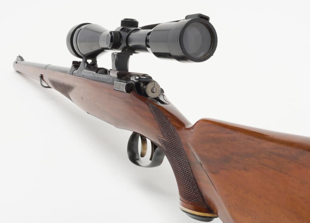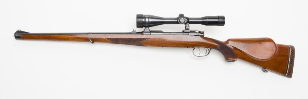 Steyr Mannlicher Model MC bolt action rifle, cal. .270 Winchester, Serial #36954. The rifle is overall very good condition with a 20” blued barrel, double set triggers and full length mannlicher stock. The rifle retains nearly all of its blued finish with a couple small scratches and loss of finish on the barrel. The rifle features a ramp front sight with brass insert and adjustable rear sight with two leafs. The finely checkered wood stock is in overall very goodcondition with small mars and compressions consistent with use. The stock has sling swivels and a brown, rubber ventilated butt pad. The bore is very good, the action crisp and markings sharp on this Mannlicher. The rifle is topped withclaw mounts and a German Nickel fixed power scope. High quality German optics in a finely crafted claw mount made specially for the Mannlicher, a nice set up. (C+R/PPT). Est.: $1,000-$2,000.