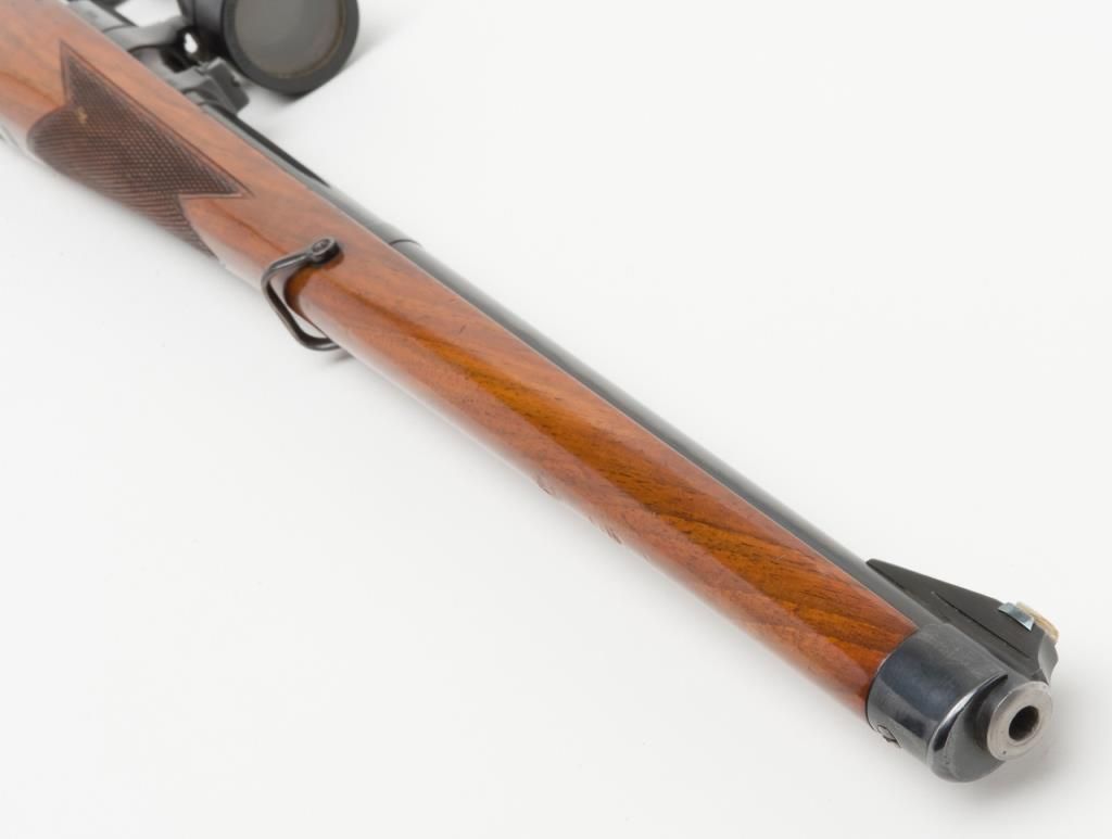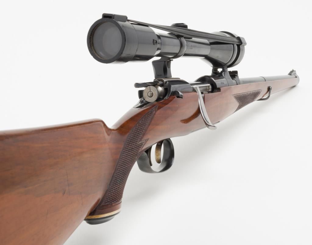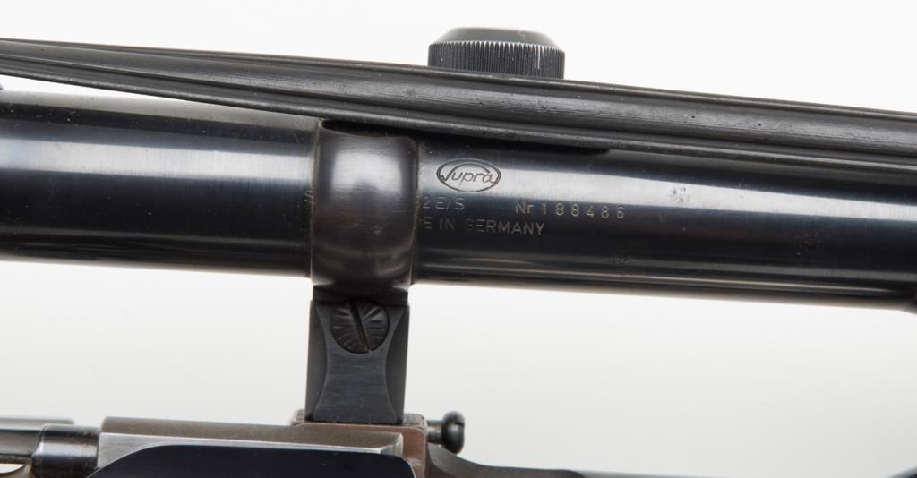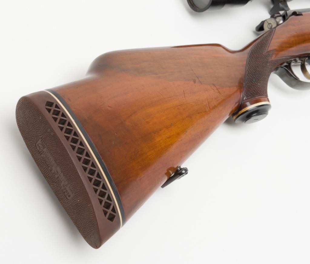 Steyr Mannlicher Model MC bolt action rifle, cal. .270 Winchester, Serial #36954. The rifle is overall very good condition with a 20” blued barrel, double set triggers and full length mannlicher stock. The rifle retains nearly all of its blued finish with a couple small scratches and loss of finish on the barrel. The rifle features a ramp front sight with brass insert and adjustable rear sight with two leafs. The finely checkered wood stock is in overall very goodcondition with small mars and compressions consistent with use. The stock has sling swivels and a brown, rubber ventilated butt pad. The bore is very good, the action crisp and markings sharp on this Mannlicher. The rifle is topped withclaw mounts and a German Nickel fixed power scope. High quality German optics in a finely crafted claw mount made specially for the Mannlicher, a nice set up. (C+R/PPT). Est.: $1,000-$2,000.