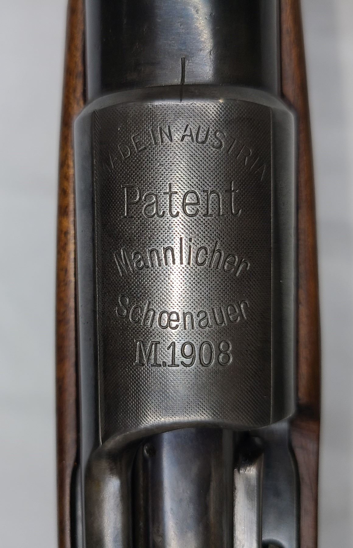 The top of the receiver is marked MADE IN AUSTRIA Patent Mannlicher Schoenauer M1908.