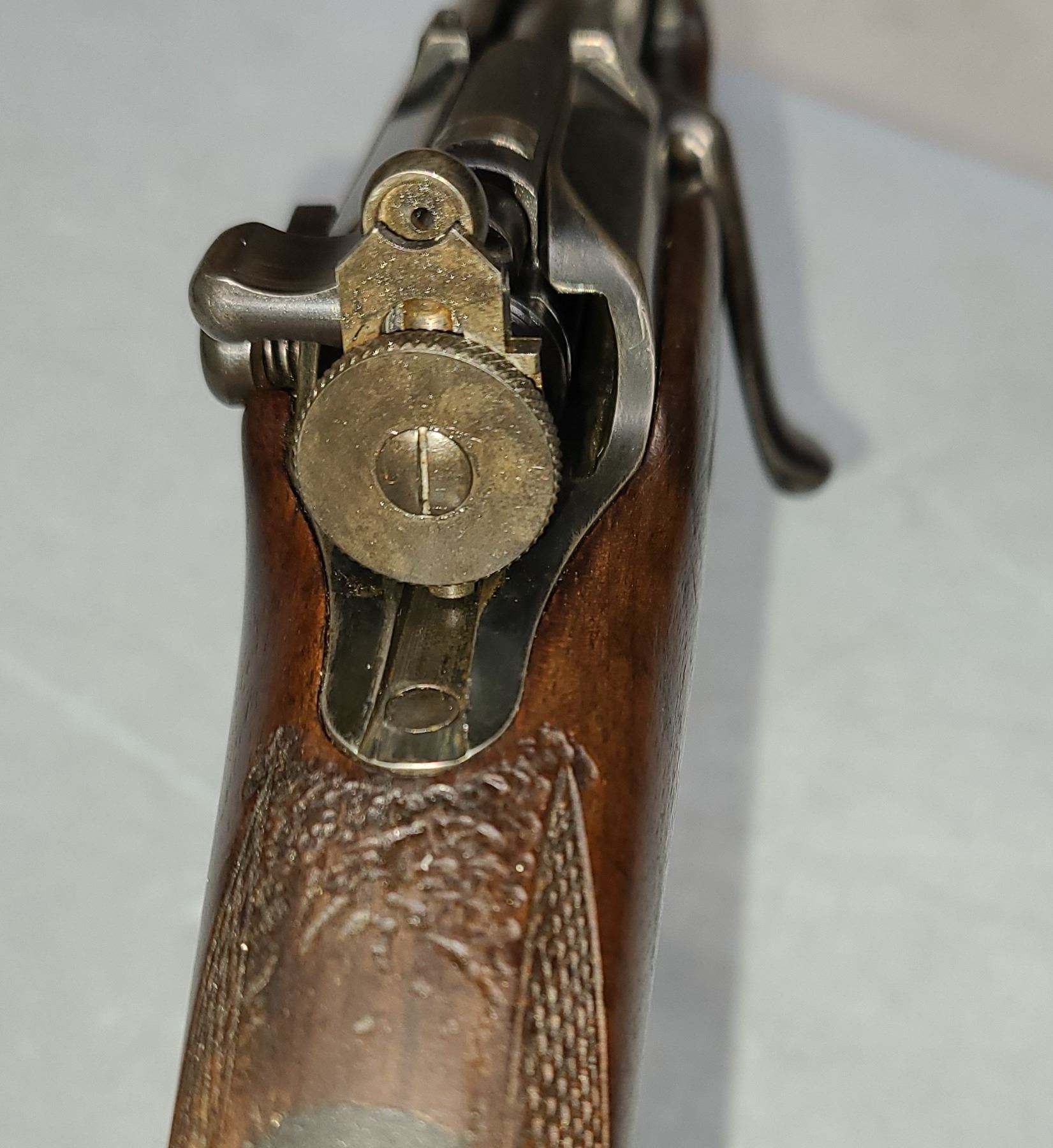 An adjustable Peep Sight has been attached to the rear of the bolt..