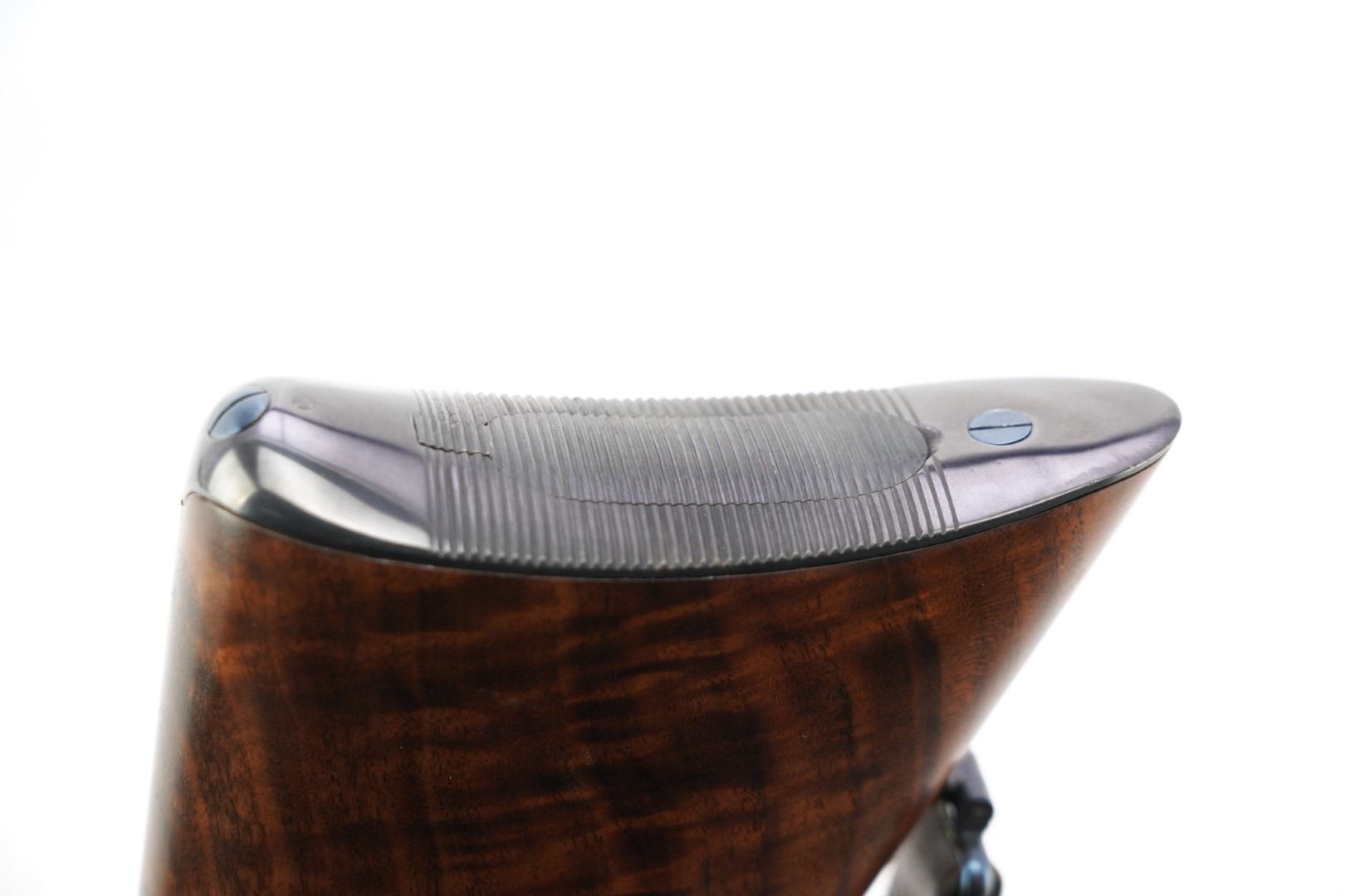 Stock Configuration & Condition: The full length checkered Mannlicher wood stock has a pistol grip, straight comb, raised cheek piece, metal nose cap, 2 sling loops, and a serrated metal buttplate with hinged door for storage. The wood shows small handing marks. The base of the grip shows an unfilled screw hole. The LOP measures 14 inches from the face of the front trigger and 13 inches from the face of the rear trigger, to the back of the recoil pad. The stock rates in about Fine overall condition.