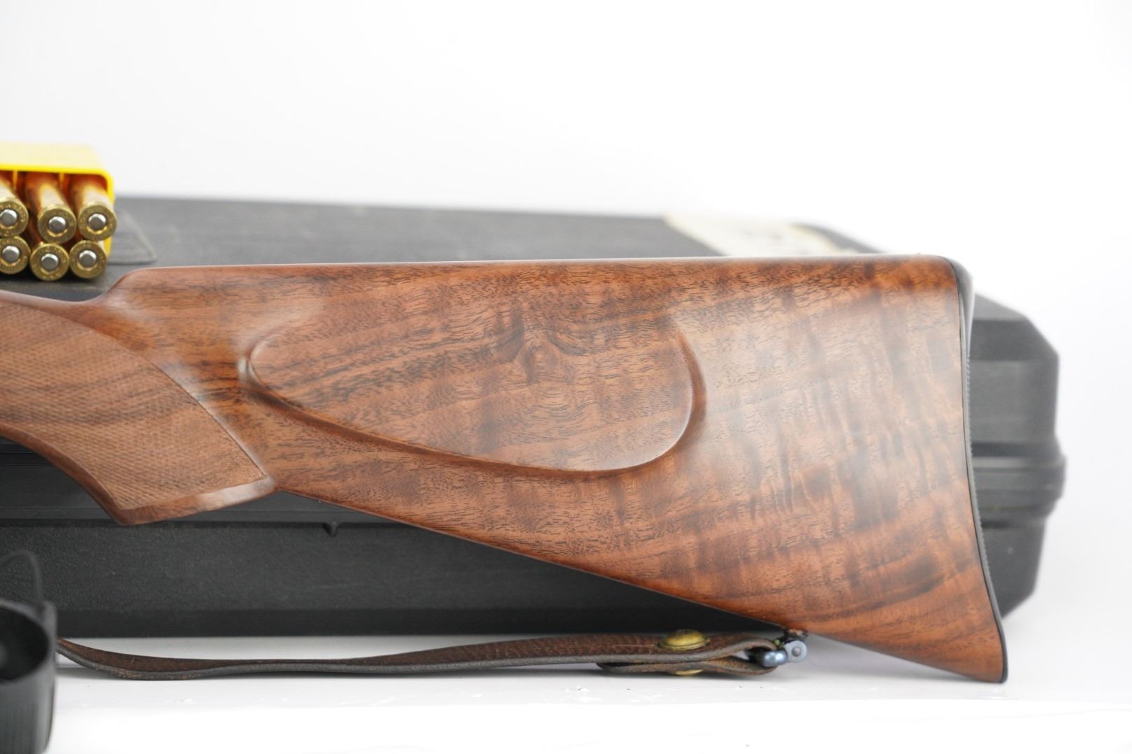 Box, Paperwork & Accessories: The rifle has a leather sling attached. The rifle comes in a plastic hard case with a set of dies, and 20 rounds of ammunition.