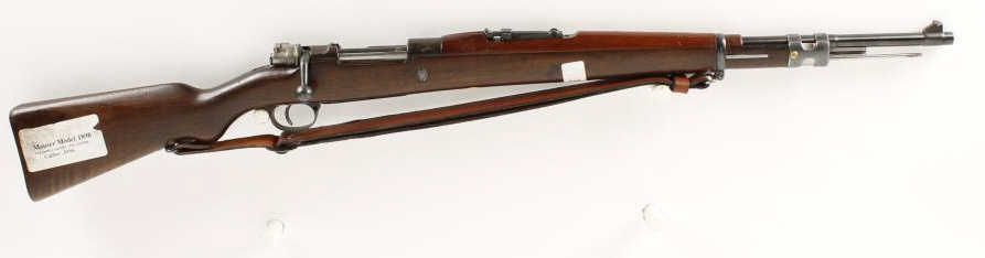 Steyr Mauser Mdl 1929 Cal .30-06 SN:34-402Columbian Mauser marked Steyr-Solothurn Waffen A.G. on side of receiver, crest still visible on top of receiver, ".30" stamped on receiver above bolt handle, full length pistol grip wood stock and hand guard, smallcartouche on top in front of rear sight, 23.5" barrel and rear sight graduated to 2000 meters, excellent bore and action. Includes leather sling. Condition: Good with light dings in wood.