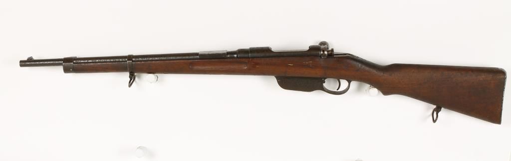 Austrian military straight pull bolt action rifle with 19-1/2" barrel. Full length wood stock, rear sight has been removed, otherwise maintains original configuration. Dark bore and good action. Condition: Fair overall showing moderate pitting throughout and wood shows age. *Curio & Relic Firearm*