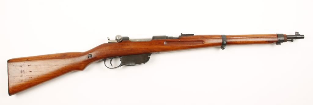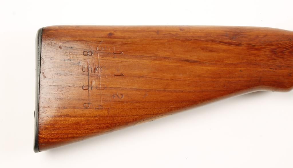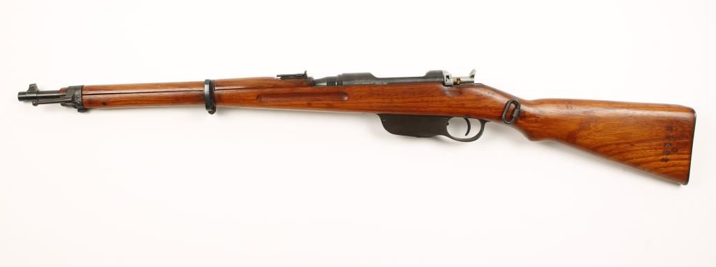 Austrian military straight pull bolt action short rifle with 19-1/2" barrel. Reblued finish, full length semi pistol grip wood stock and upper handguard, side mount sling swivels, bayonet lug and flip up rear graduated sight marked to 24. Import marked. Dark bore and good action. Condition: Very good as refinished. *Curio & Relic Firearm*