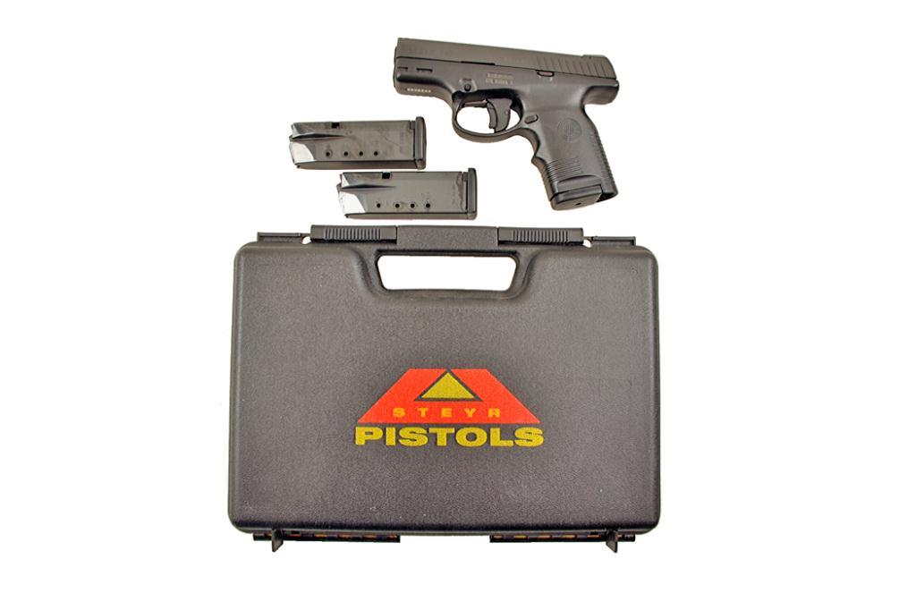 Steyr Mdl S 40 Cal .40S&W SN:032107 Consecutive serial number to above. DA semi-auto concealed carry pistol made in Austria. Matte black slide, polymer frame with molded in grooved grips, 3 1/2" barrel with low drag white pyramid sights, good bore anConsecutive serial number to above. DA semi-auto concealed carry pistol made in Austria. Matte black slide, polymer frame with molded in grooved grips, 3 1/2" barrel with low drag white pyramid sights, good bore and action. Condition: Excellent - no sign of use. In original black carry case and sleeve with two extra magazines.