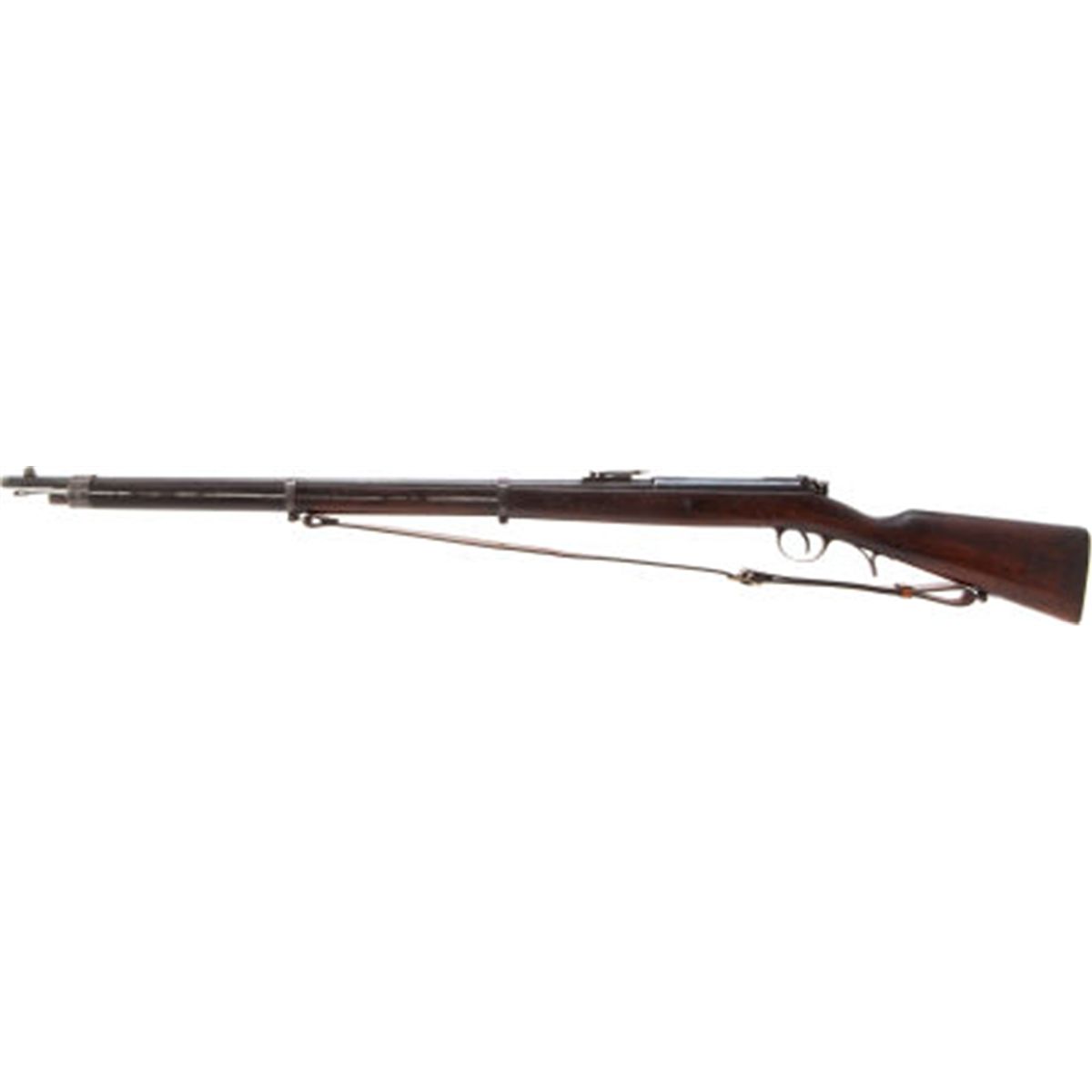 Steyr Model 1886 Bolt Action Military Rifle. Serial no. MM243, 8mm, 32-inch barrel with standard military sights, two barrel bands and bayonet lug. Bolt action with straight toggle. Blued finish. Walnut stock with modern leather sling by Boyt. Condition: Good. Metal with grey-brown age patina. Wood with wear and dents. Action good. NRA FIREARMS FOR FREEDOM PROGRAM