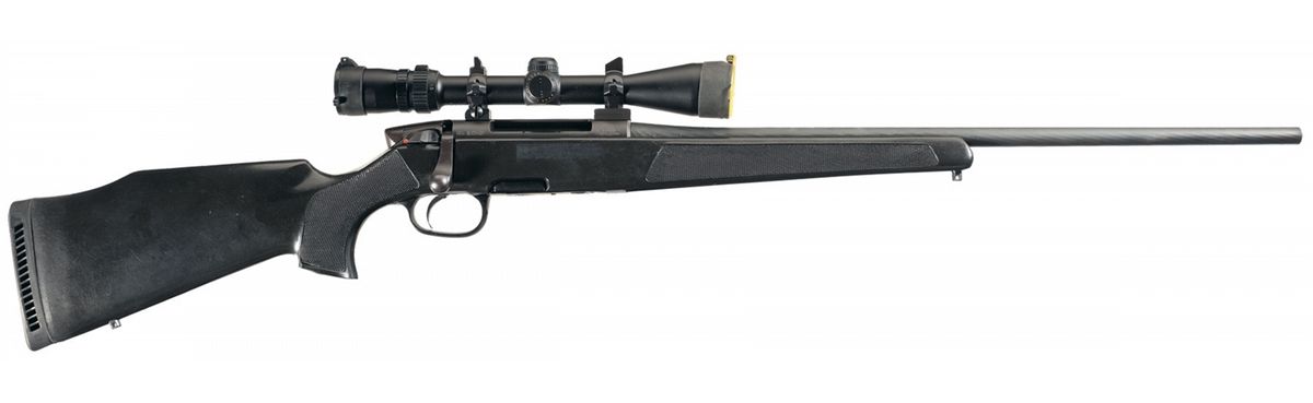 Introduced in 1995 this is an economy version of the Model M Professional. The barrel is a matte black with a spiral pattern and no sights installed. Mounted with Bausch & Lomb Elite 4000 1.5 - 6.0 X 35 scope with lens covers. With 1 extra detachable 5 round magazines. Standard markings and features of the model. Fitted with a black synthetic checkered pistol grip stock with a black vented rubber recoil pad, raised cheek rest and sling swivel studs.