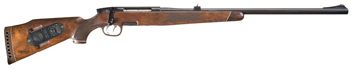 Manufactured in Austria. Features fixed front and rear sights. Standard markings on the barrel and receiver. Double set triggers and a detachable rotary magazine. Fitted with a one piece checkered stock with a rosewood forend and grip cap. The stock also features an additional magazine with an integral housing on the right side.