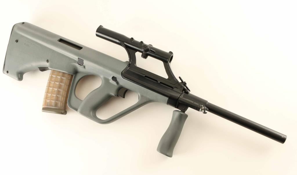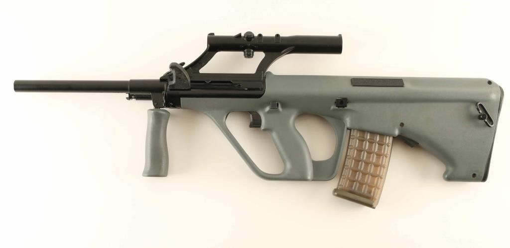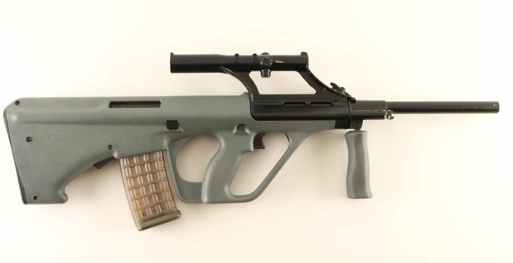 Austrian military style semiautomatic rifle chambered in 223 Remington, imported by GSI Inc, Trussville AL. Features bullpup layout with action located inside buttstock, hard chrome lined 20 inch barrel, forward folding grip, manual safety, sling swivels, integral 1.5x optic with crosshair and circle reticle, simple fixed backup sights molded into top of scope tube. Stock incorporates a thumbhole type loop behind the grip. Rifle appears like new, with hardly any observed signs of handling. Includes one 10 and one 30 round factory magazine, manual, original factory cardboard shipping box. Condition is NRA Perfect - Like New ***Modern Firearm***