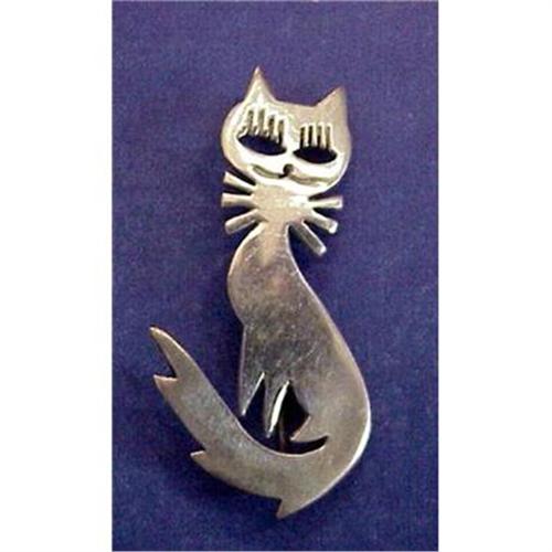 Lovely sterling silver brooch - Made by T.M. $ 238, Mexican Arts & Crafts in Deco style - Lovely and unique i would title it Smiling Cat - Very good condition - Free of damage - Measures about 2" long - Buyer to pay 6.00 for ship. + insce. - Thanks!