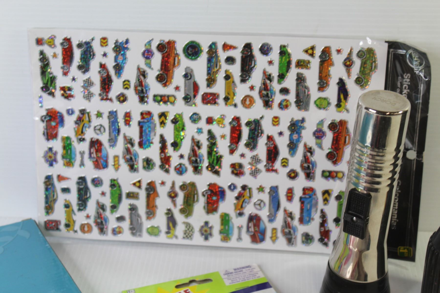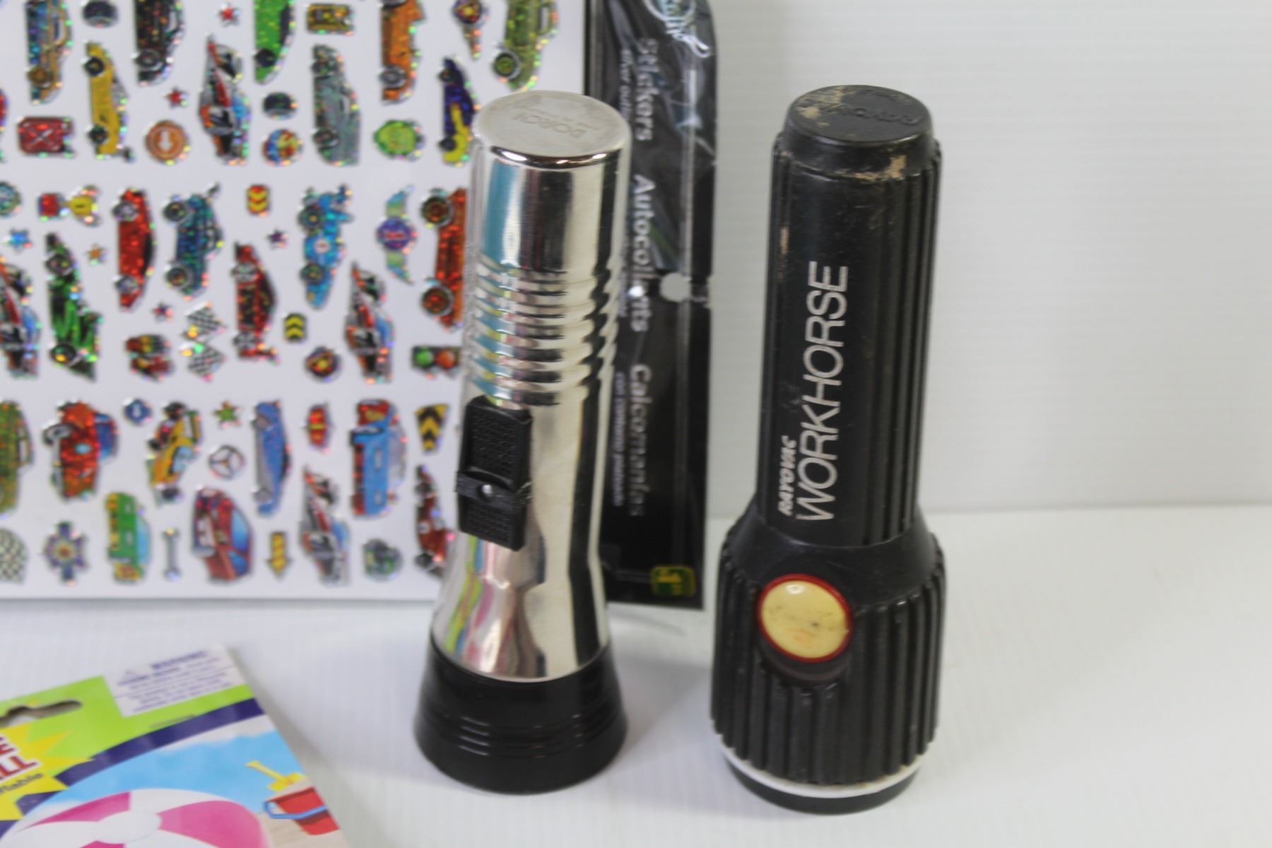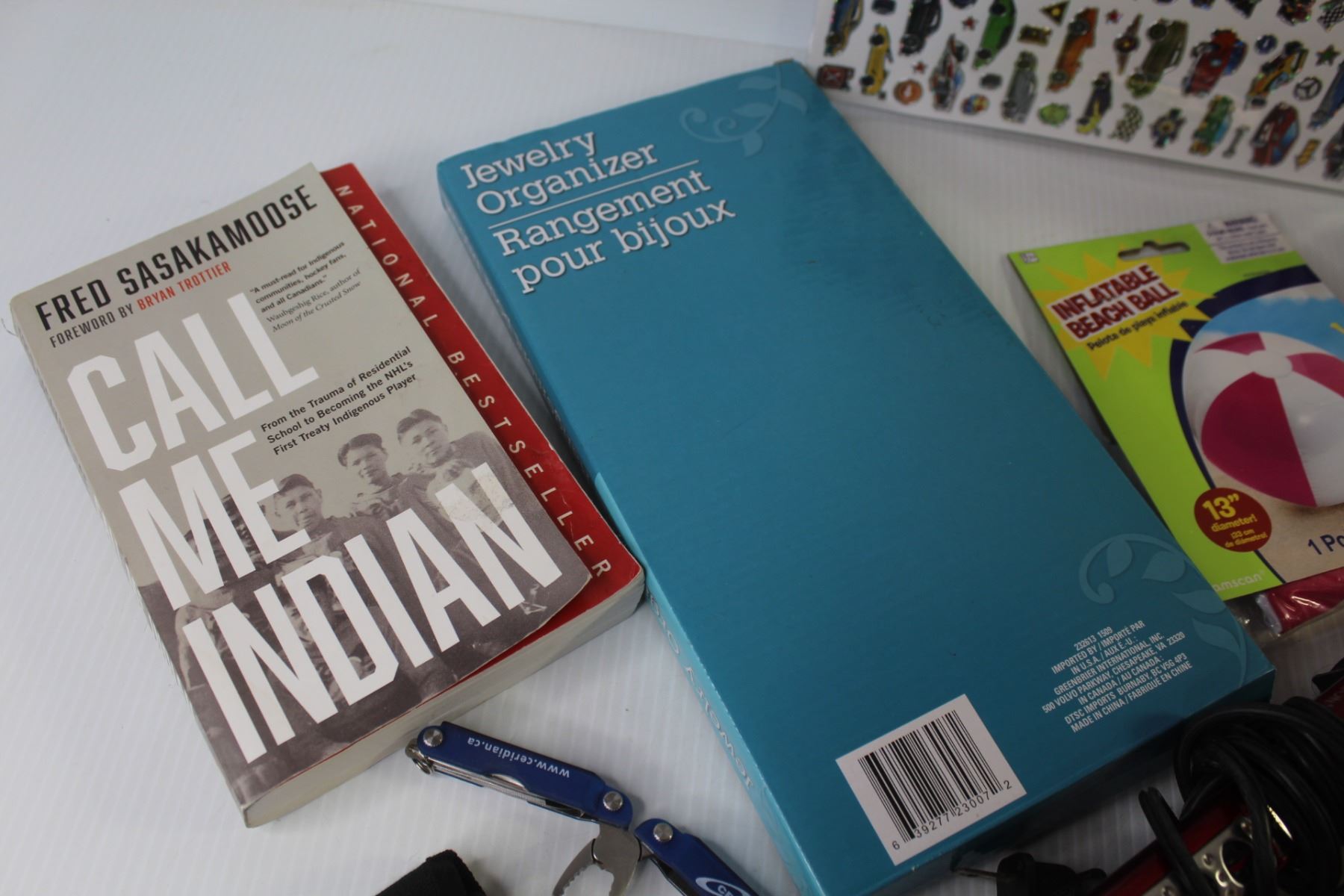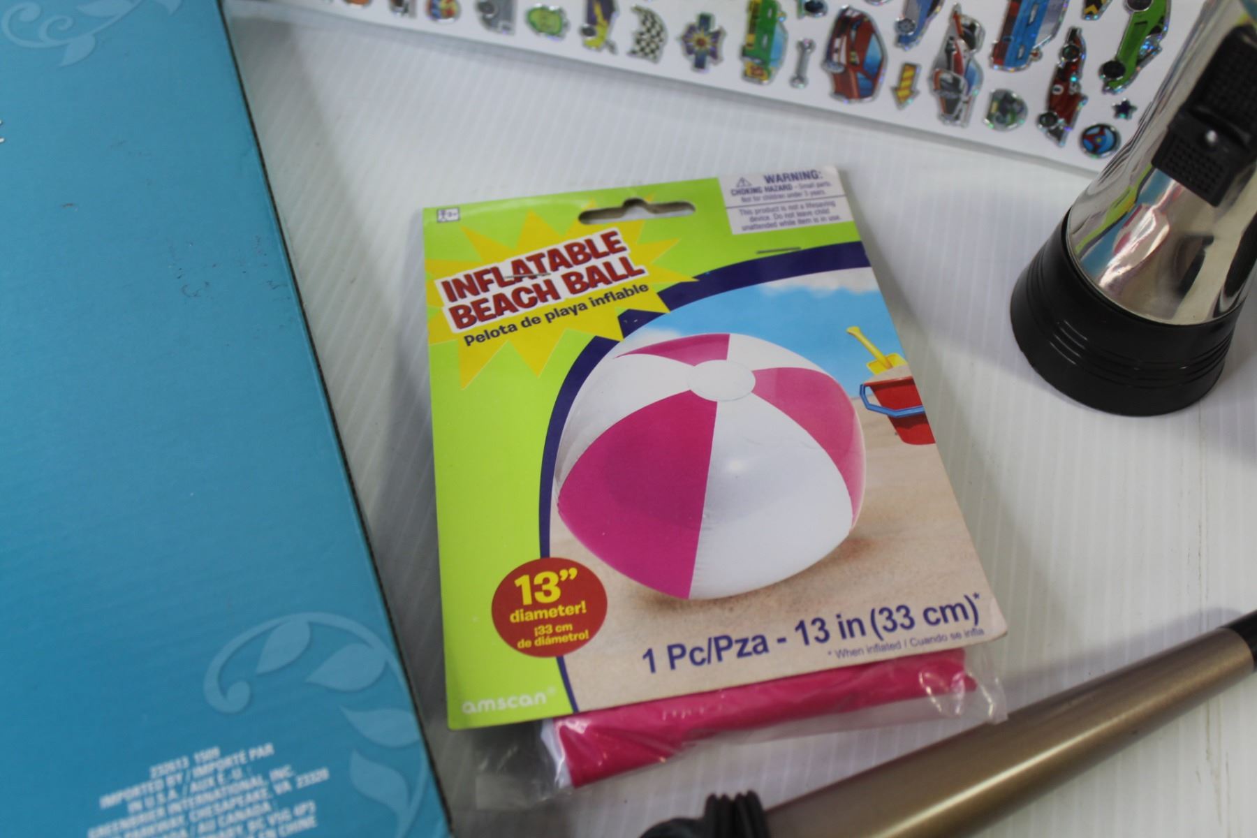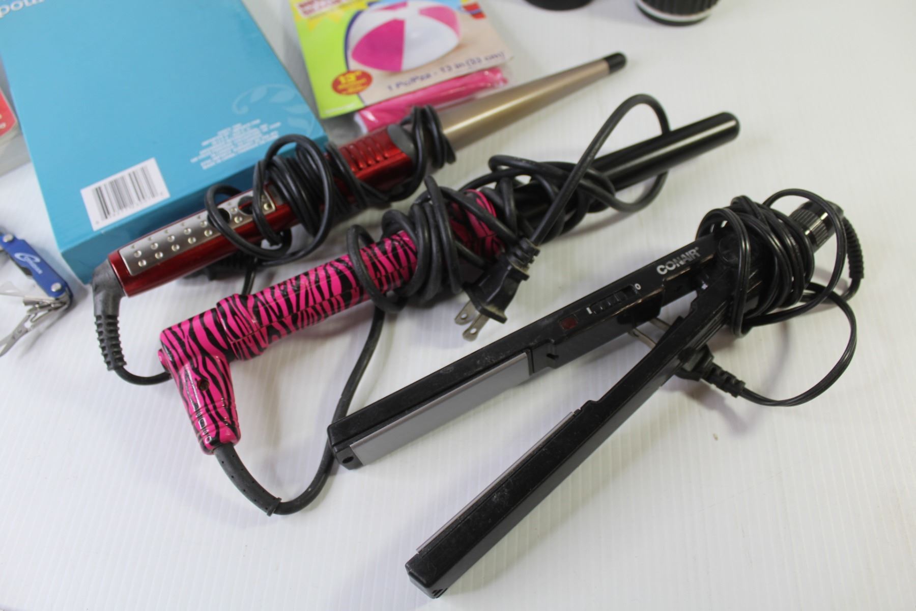 Stickers - (2) Flashlights - Book (Call Me Indian) - Jewel Organizer in Box - Inflatable Beachball - (2) Curling Irons & Straightener (all power on - heat up) - Sm Multi Tool