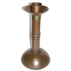 Stickley Brothers candlestick, hammered copper with applied bands, original patina, #84, 10.5”h