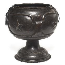 Rare Stickley Brothers jardinière, large footed form in hammered copper, geometric design, two applied handles, original patina, numbered #418, 17”h, a shape we've never seen