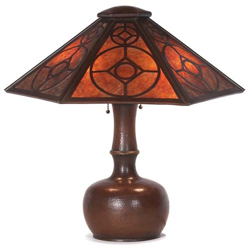 Stickley Brothers lamp, hexagonal shade with cutout design of circles and diamonds over replaced mica panels, hammered copper bulbous base, unsigned, original patina, 20.5"dia. x 21"h, very good condition