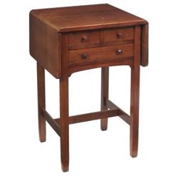 Stickley Brothers stand, #2569, dropleaf form with two half drawers over one full drawer, original wood knobs, refinished, unsigned, 18”w x 18”d x 29”h, very good condition