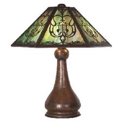 Stickley Brothers table lamp, hexagonal slag glass shade with metal overlay over a hammered copper base, new patina, unsigned, 19”dia. x 23”h, very good condition