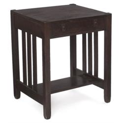 Stickley Brothers table, unusual size with single drawer and original copper hardware having three vertical slats at each side, original finish, unsigned, 24”w x 22”d x 30”h, very good condition