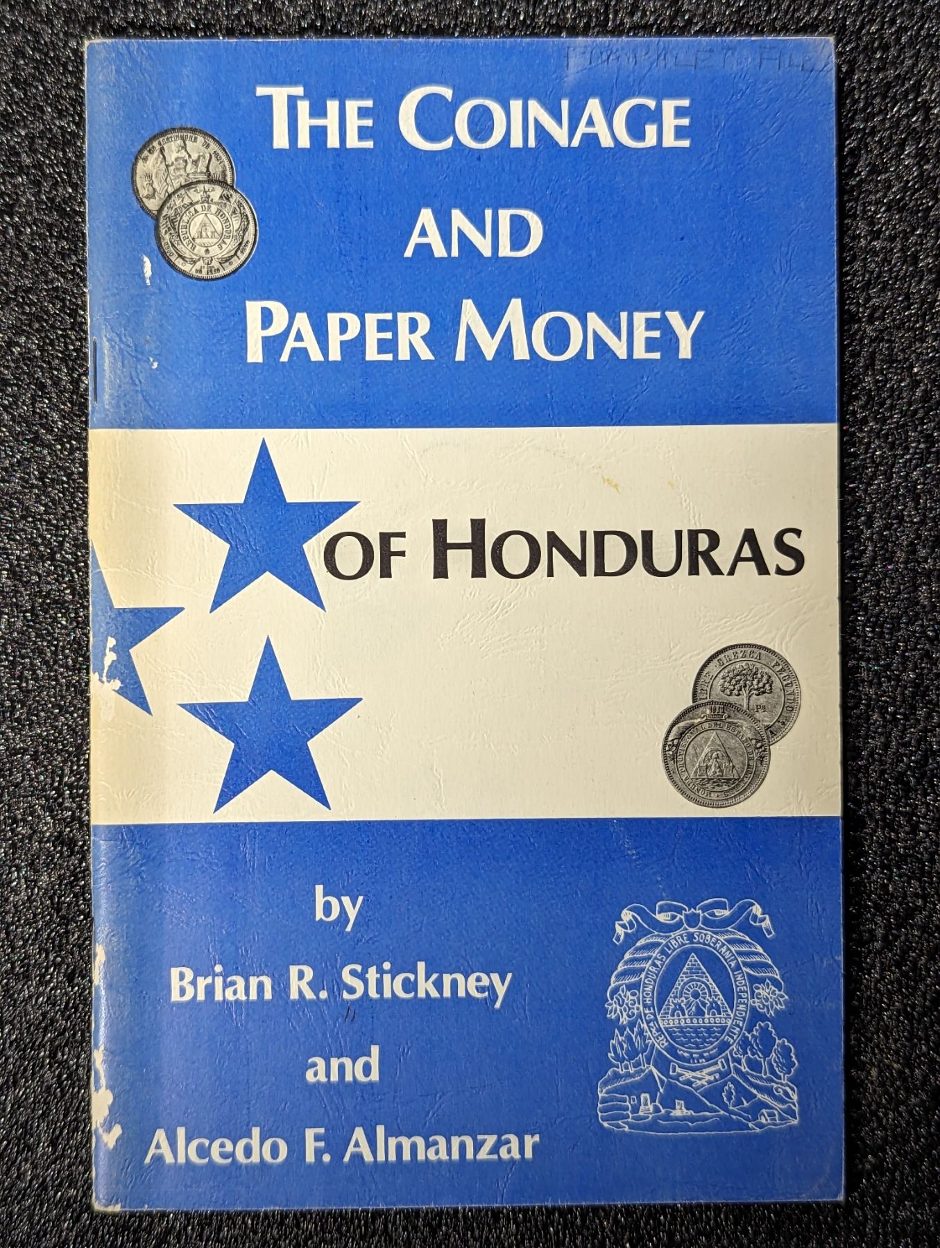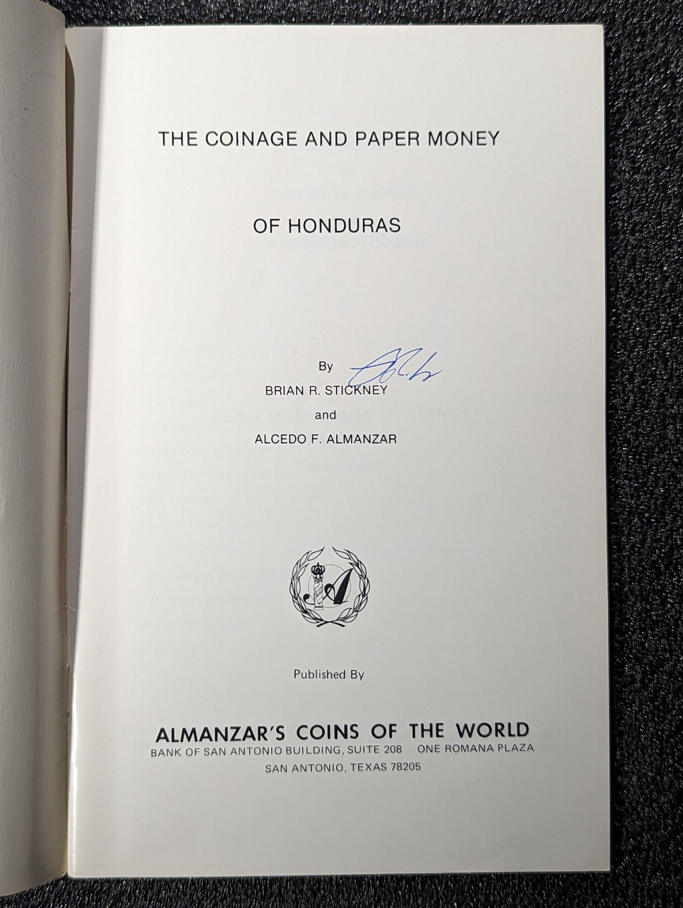 Stickney, Brian R. & Alcedo F. Almanzar. THE COINAGE AND PAPER MONEY OF HONDURAS. Almanzar's Coins of the World, San Antonio. 1981. 12mo. 62 pages. Original printed card covers. Signed by the author. b&w coin and currency photos throughout. English text. rubbing along spine. Very Good. This book is a guide to the gold, silver and copper coins and the paper money of Honduras. The book is organized by numismatic history before 1879, numismatic history 1879-1919, gold coinage, colonial coinage, State of Honduras coinage, Provisional issues, Republic coinage, Lempira system, Patterns and proofs, Medals, tokens, counterstamps and oddities and Paper money. Each coin/note listed has a catalog number, mintage and pricing in three or four grades. Lot weight: 0 lbs 4oz. Subject(s): Honduran Coinage, Paper Money.