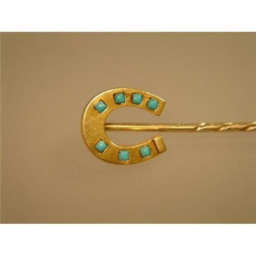 A lovely English horseshoe stickpin in 15ct gold set with Turquoise square stones!Circa 1890. </em></td>